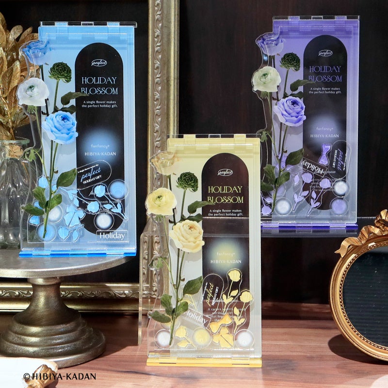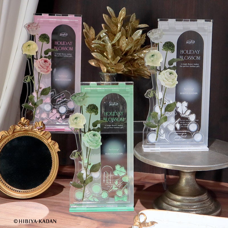 fanfancy+で人気の、アクリルスタンドやカードを収納して飾れる「アクリルフレーム」は、様々なグッズサイズに対応した4種をご用意。フラワーアレンジメントの鮮やかな色彩や繊細な花々をあしらい、飾るだけでホリデームードを楽しめるデザインに仕上げています。