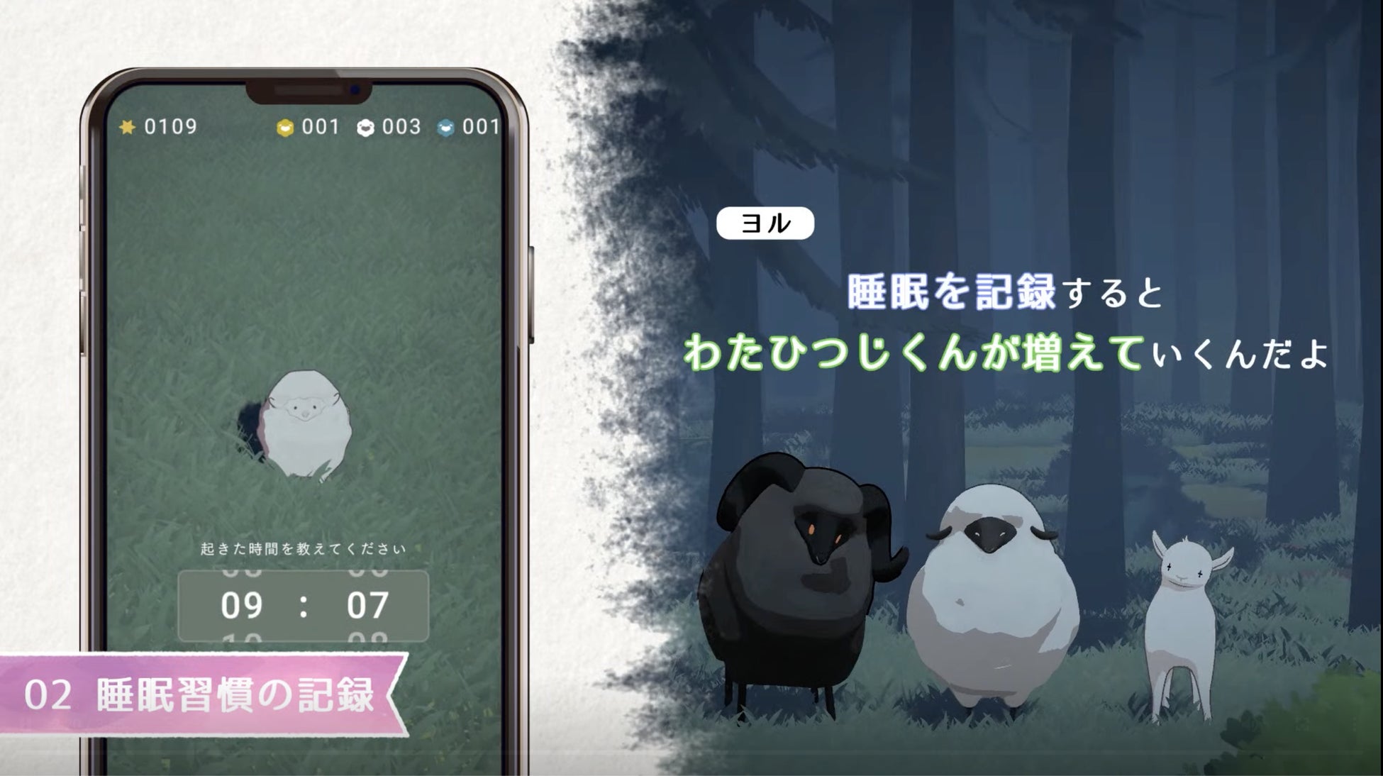 本作のテーマは「スマホから離れて自分だけの静かな夜を過ごすこと」。プレイヤーは、ひつじのキャラクター「ヨル」と共にゲーム内で日々を過ごし、規則正しい就眠や、睡眠前のデジタルデトックス習慣を継続することで、豊かな音楽を集めながら旅を進めていきます。