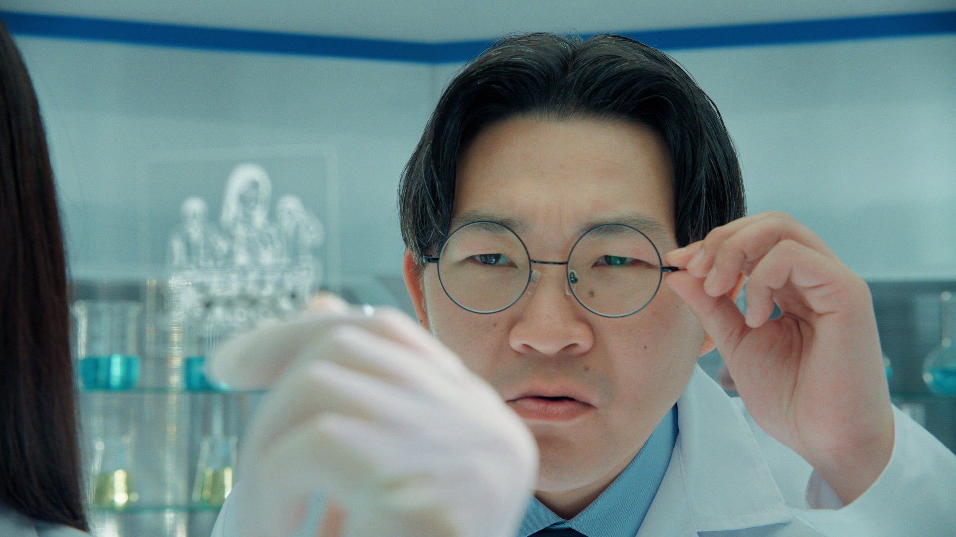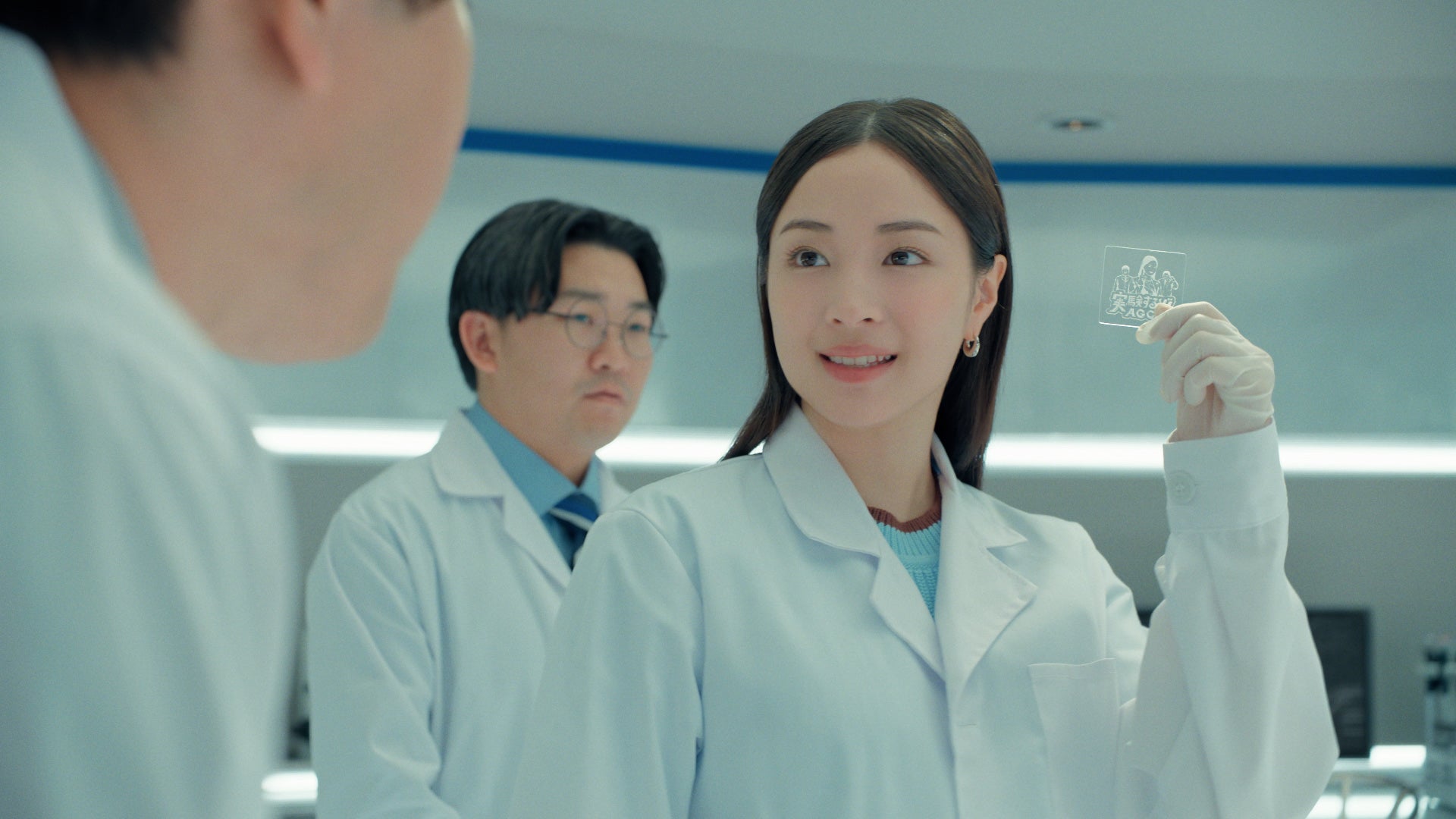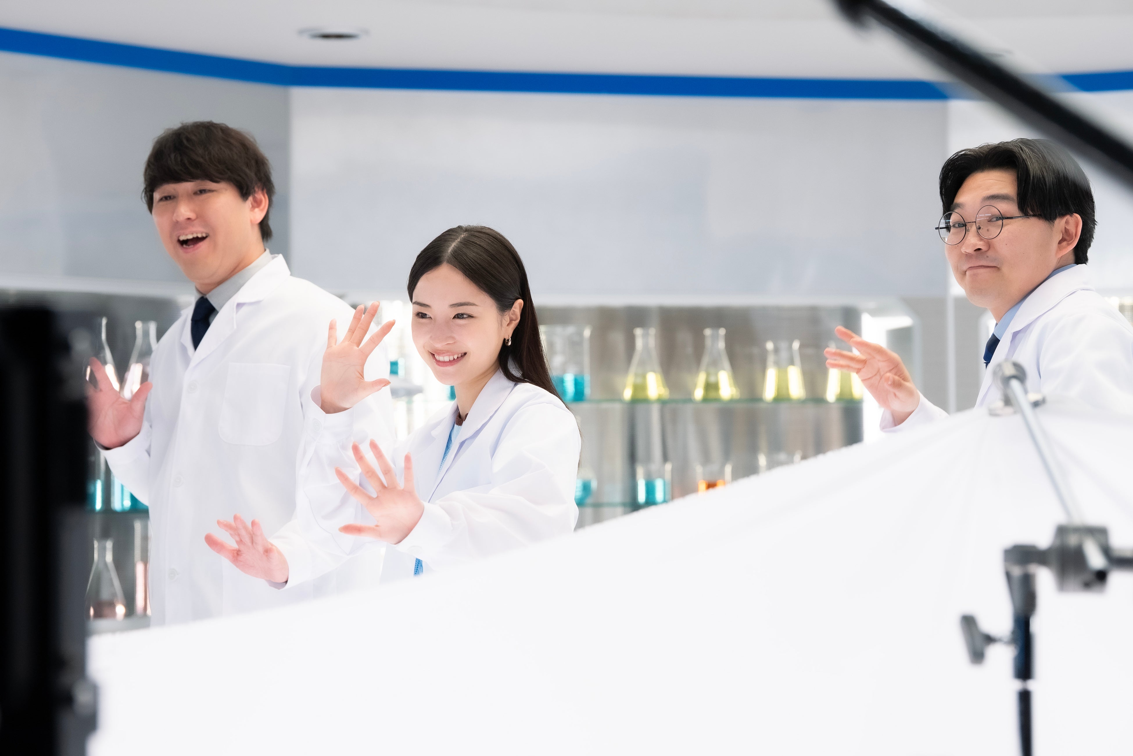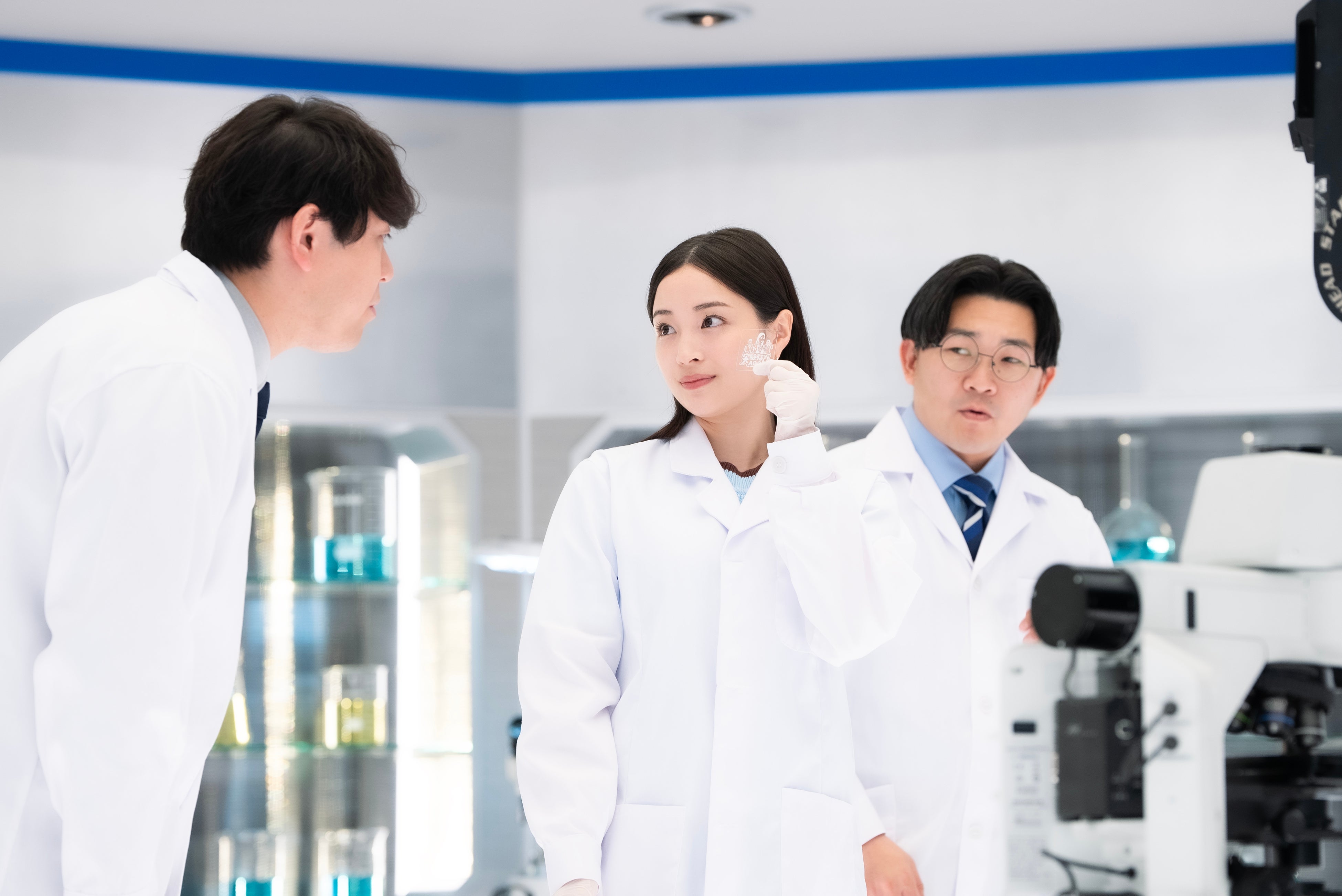AGC の新CM「実験するぞ!AGC/ガラスコア篇」に登場したのは、昨年に引き続き、女優の広瀬すずさんと、お笑いコンビ・オズワルドの伊藤俊介さん、畠中悠さん。実験道具がずらりと並び、大きな顕微鏡もセッティングされた本格的なラボを舞台に、白衣姿の三人が撮影に臨みました。コンテ説明の段階から和気あいあいとした雰囲気で、2年目のタッグならではの息の合った空気感が漂います。