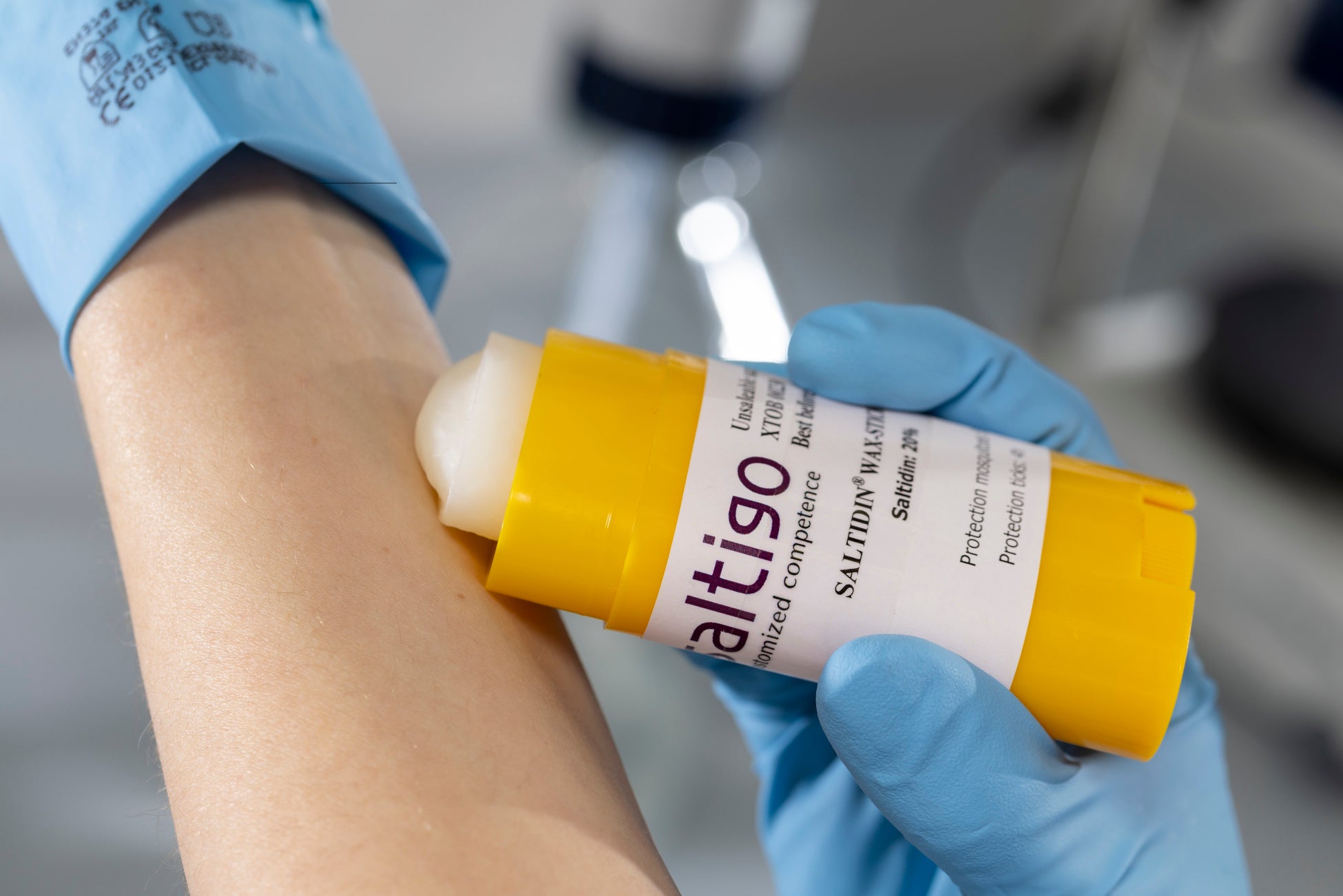 この活性成分は無色、無臭で肌に優しく、汗にも強い特性を持ち、繊維やプラスチックを腐食させることもありません。また、長時間にわたって効果を発揮します。独自の分子構造により、「サルチジン」は昆虫の受容体を妨害し、蚊が人間を吸血源として認識することを防ぎます。このカモフラージュ効果により、ダニやハエ、その他のさまざまな昆虫からも身を守ることができます。「サルチジン」は、マラリア、デング熱、ジカ熱などの病気を予防する蚊よけ活性成分として、世界保健機関(WHO)が推奨しています。