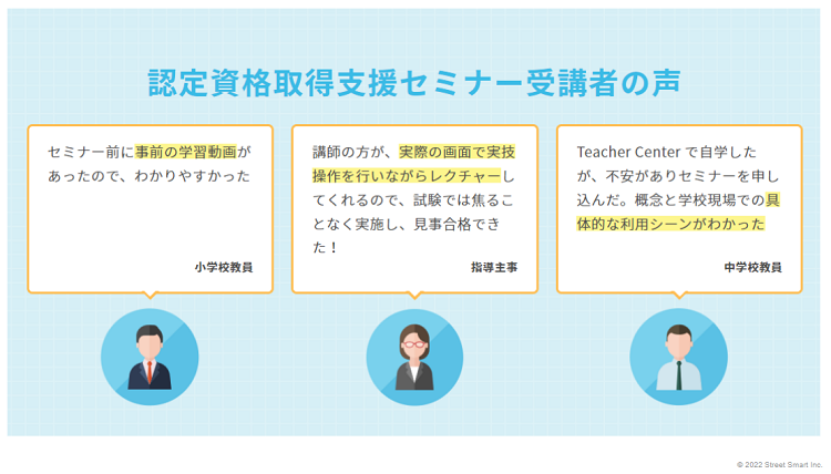 ・中学校教員:Teacher Center で自習したが、不安がありセミナーを申し込んだ。概念と学校現場での具体的な利用シーンがわかった