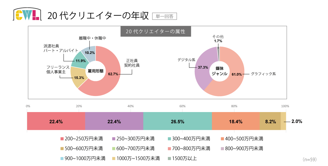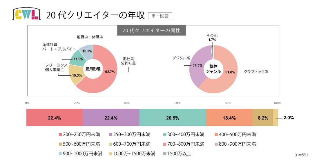 20代は正社員、契約社員が約62%を占め、グラフィック系のクリエイターがやや多い属性。