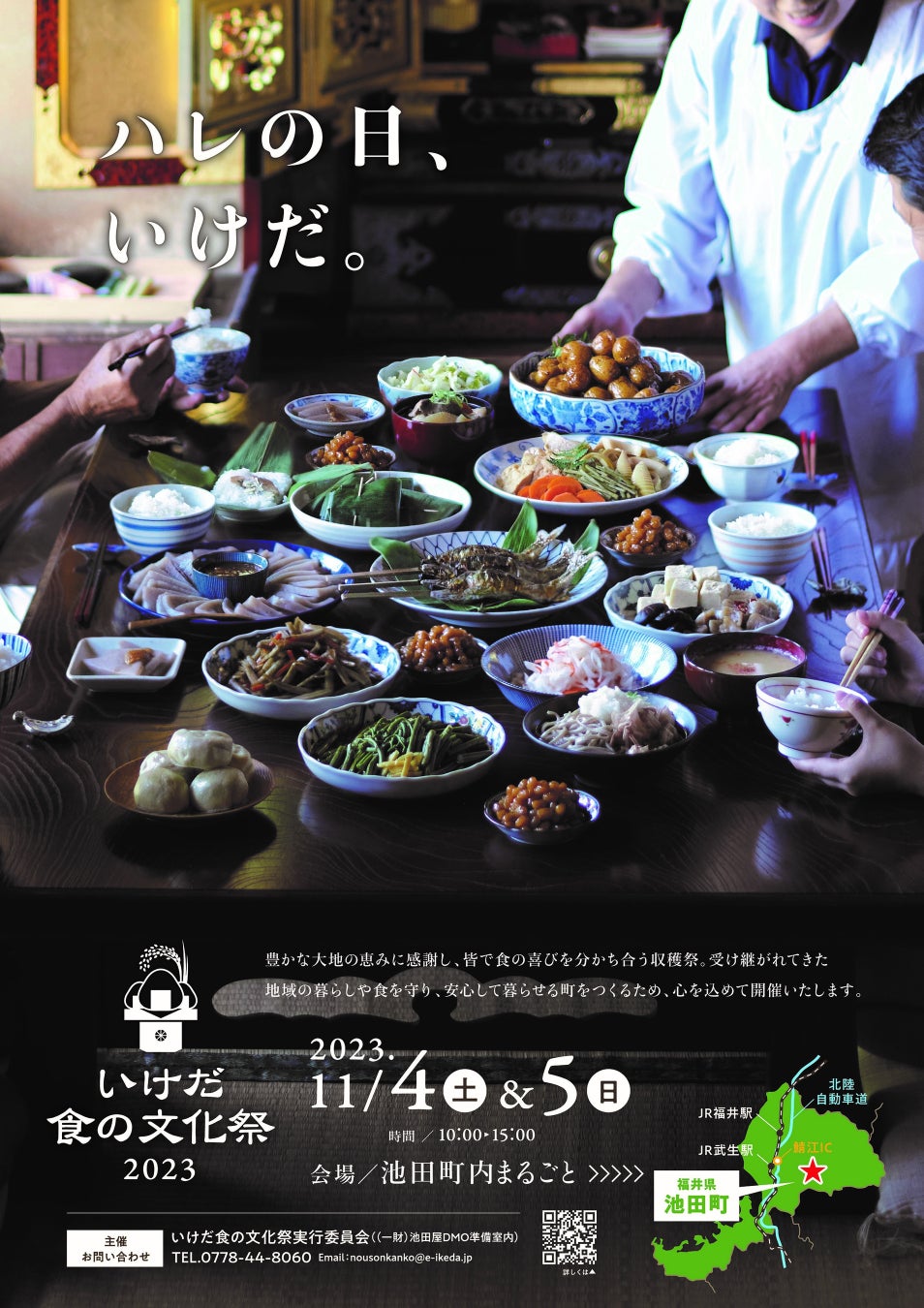福井県池田町は令和5年11月4日(土)・5日(日)の2日間、町内全域で「いけだ食の文化祭 2023」を開催します。周囲の山が鮮やかに色付く紅葉の時期、自然の中で池田町の豊かな食文化を味わってください。