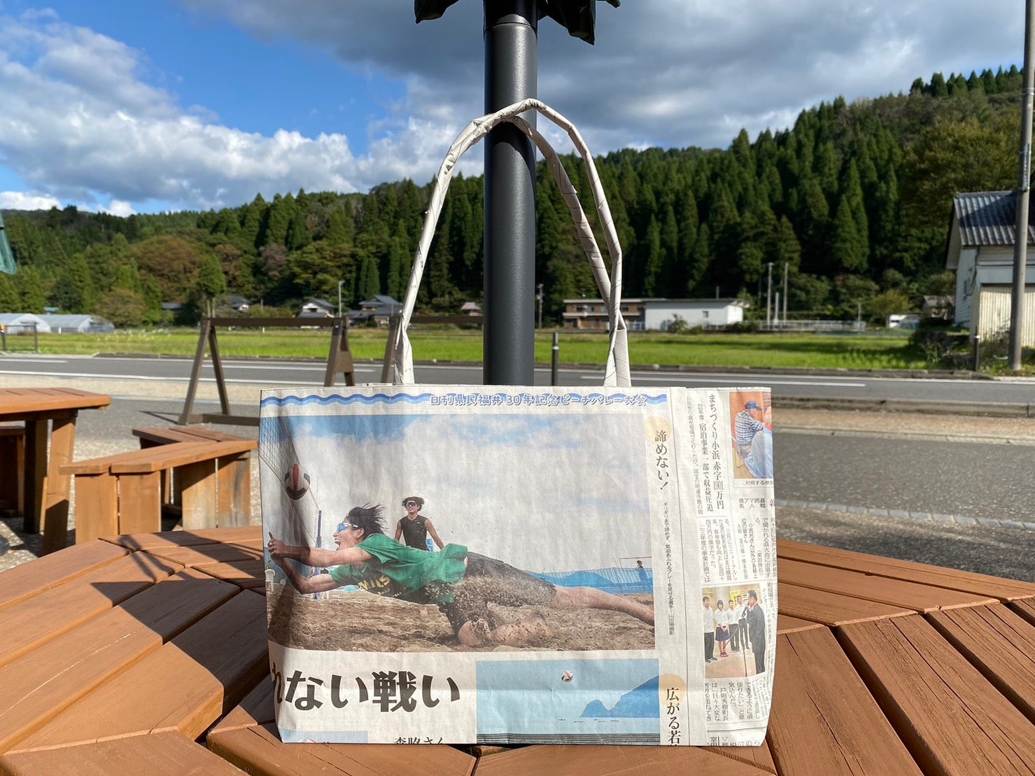 環境に負荷をかけるプラスチックごみを削減するため、池田町婦人福祉会の協力を得て、「新聞紙マイバック」を300個手作りしました。案内所(こってコテいけだ、お祭り広場)にてアンケートにお答えいただいた方にプレゼントします。このバックを持って、町内のお店を巡ってください。