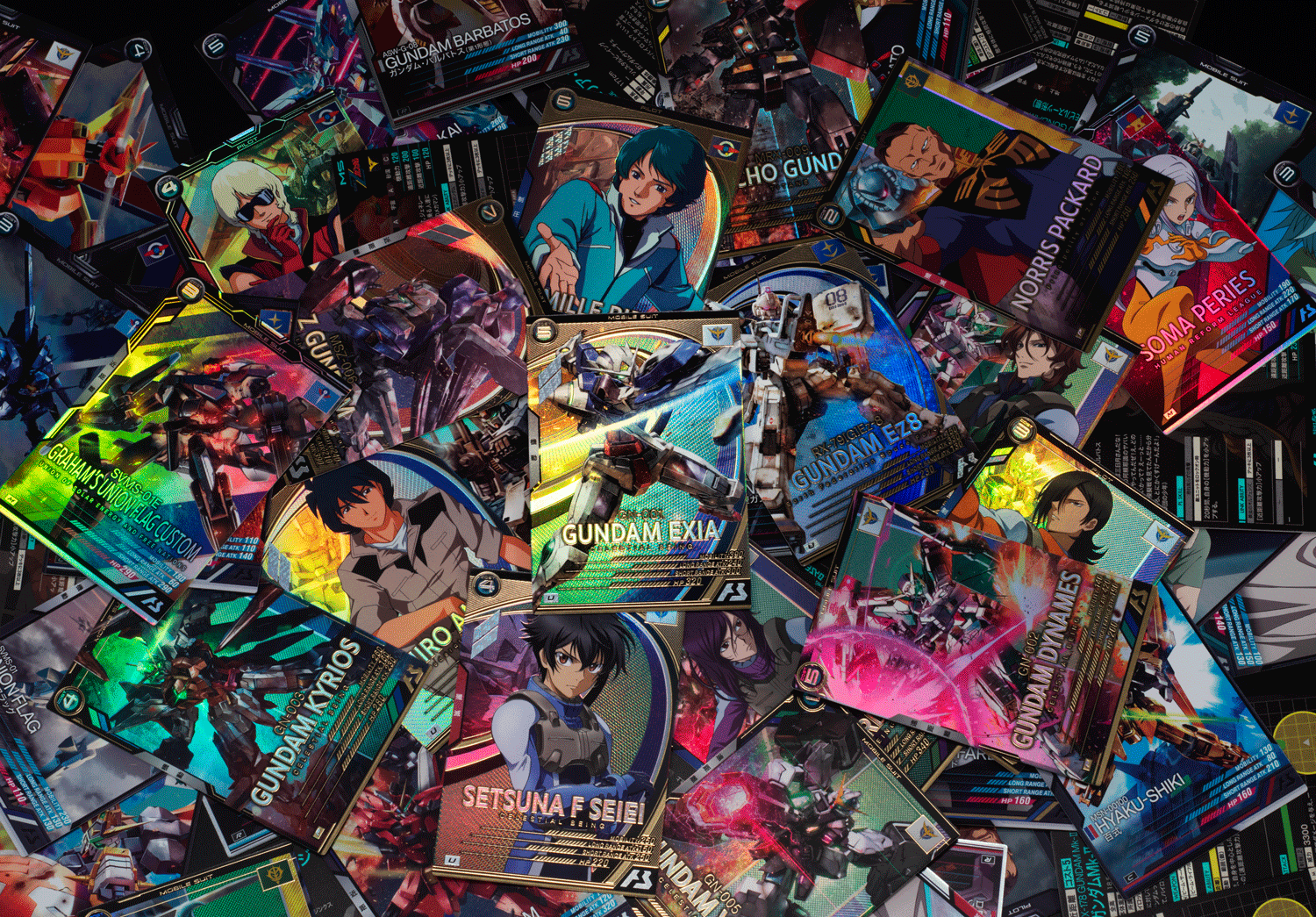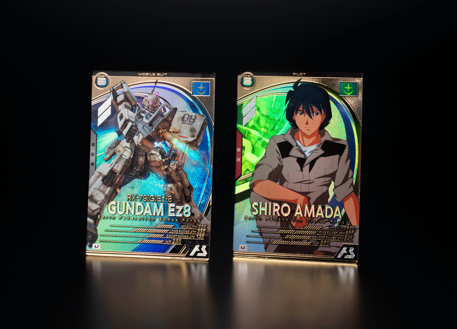 「機動戦士ガンダム アーセナルベース」から払い出されるカードは、全レアリティでカードが光る高級仕様。レアリティが上昇するごとに、立体金色箔やホロなどを組み合わせた加工が加わっていきます。商品カードイラストは全点描き下ろしとなっており、ここでしか見ることができないオリジナルイラストをお楽しみいただけます。