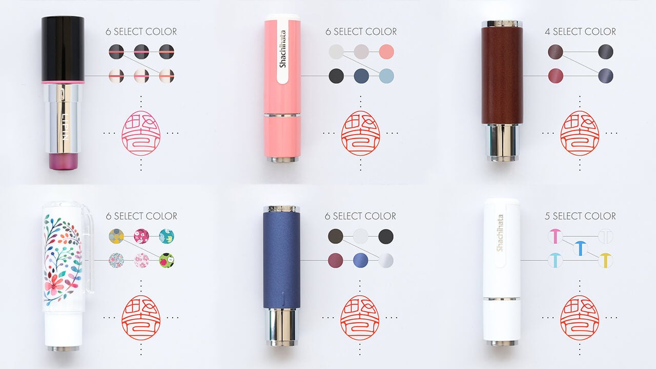 シンプルな手になじみやすい形のアルミ製のスタンプや、定番であるシヤチハタネーム9のスタンドタイプなどをラインナップ。