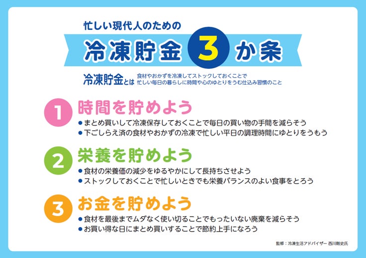 その活動の一つとして、「冷凍貯金ラボ」のアンバサダーである時短料理研究家・若菜まりえさん考案の「冷凍貯金」を活用した2週間分(平日10日分)の「平日レスキューレシピ」を特設サイトにて公開しております。「平日レスキューレシピ」とは、休日にまとめて食材を購入・「冷凍貯金」しておくことで、平日の献立づくり、買い物、調理の手間を減らせる時短レシピです。このレシピを活用すれば、料理する人の約8割が悩んでいる献立づくりの悩みも解消でき、平日の買い物・調理の手間をラクにすることができます。