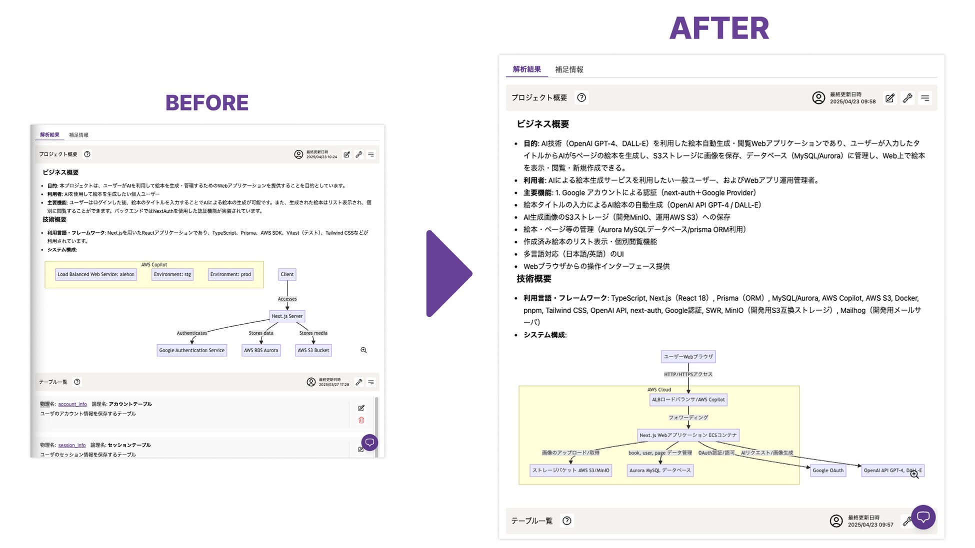 生成された仕様書をベースに、ユーザーが修正・更新しながら活用できる設計はそのままに、複雑なシステムでも仕様把握をよりスムーズにする、“実務で使えるドキュメント生成体験”をさらに強化しています。