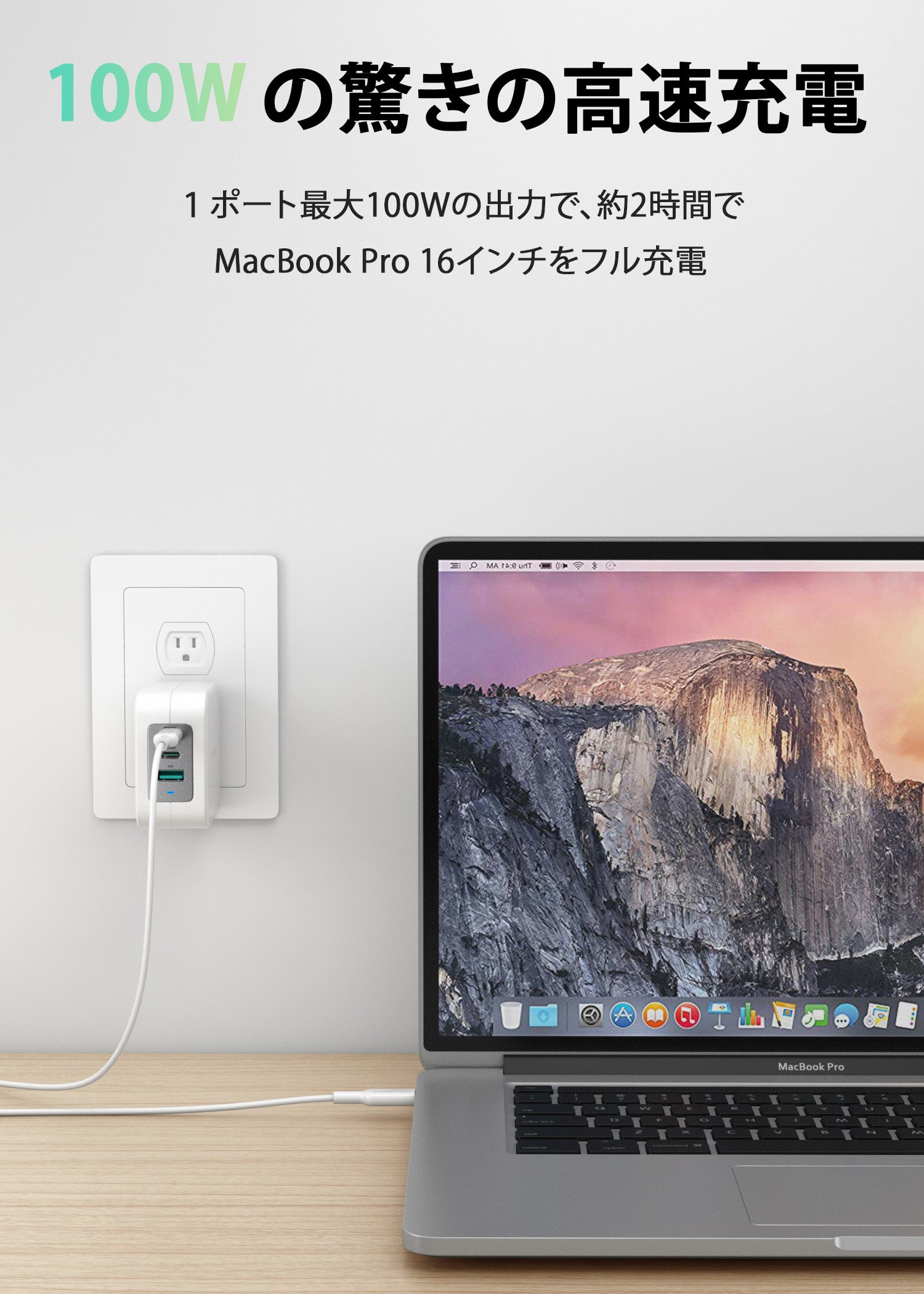 USB Power Delivery(PD)対応の合計最大100Wの高出力でノートPCからスマートフォンまで幅広い機器に急速充電できます。※本製品には、100Wケーブル2Mが付属しています。