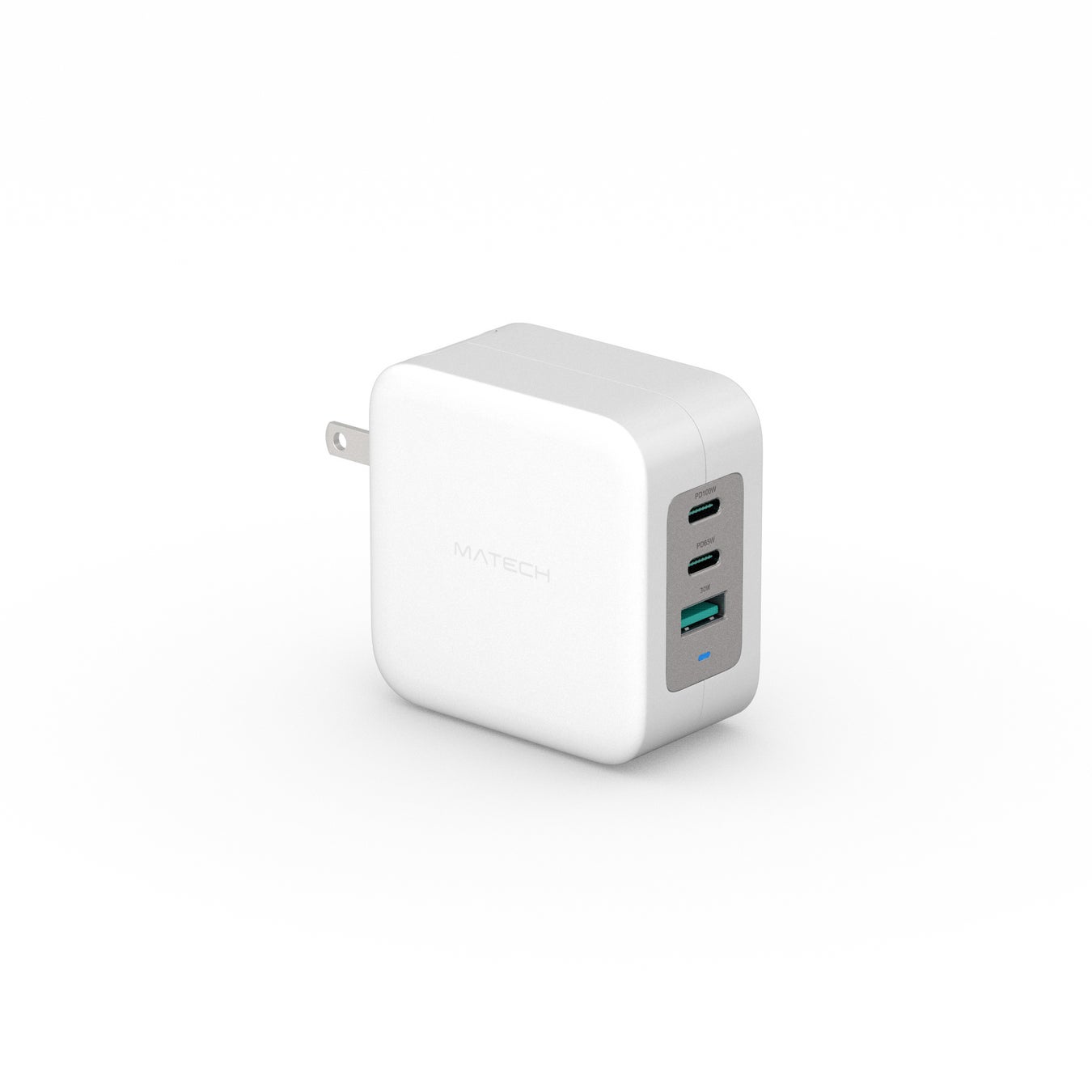 次世代USB急速充電器「MATECH Sonicharge 100W Pro」は、「パワフルさ」と「圧倒的なポータブル」を実現しました。次世代パワー半導体「GaN」を採用し、Power Delivery 3.0を搭載した単ポート最大100W出力のUSB Type-Cポート(以下Type-C)1つと、最大65W出力のUSB Type-Cポート(以下Type-C)1つと、Quick Charge 3.0/SCP/AFC/FCP/AP2.4/BC1.2を搭載した最大30W出力のUSB Type-A(以下USB-A)ポート1つを備えています。Type-C 2ポート合計でPD65W + PD30W 最大95Wのパワフルな出力が可能な上、ほとんど全てのUSB機器に最適な速度でフルスピード充電できるため、複数のモバイル機器を毎日使いこなしている方に最適です。