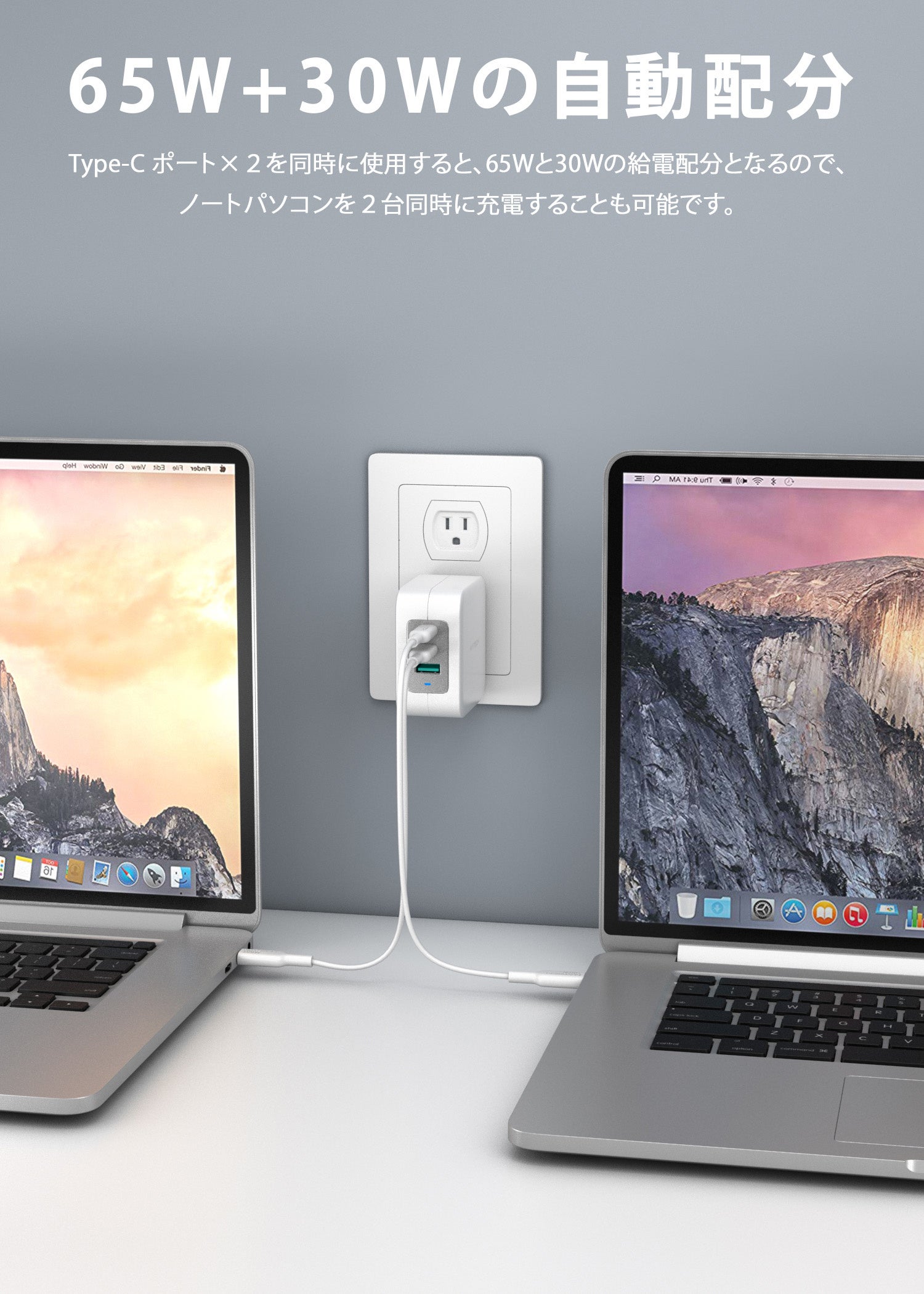 合計最大95Wの高出力でノートPCをPD65W+PD30W 2台同時に急速充電できます。利用機器毎に異なる充電器を持ち運ぶ必要はありません。