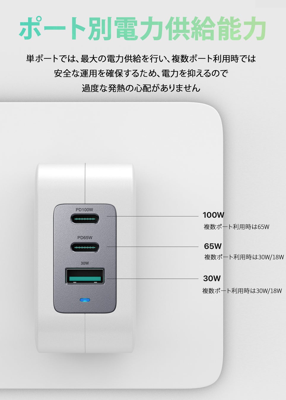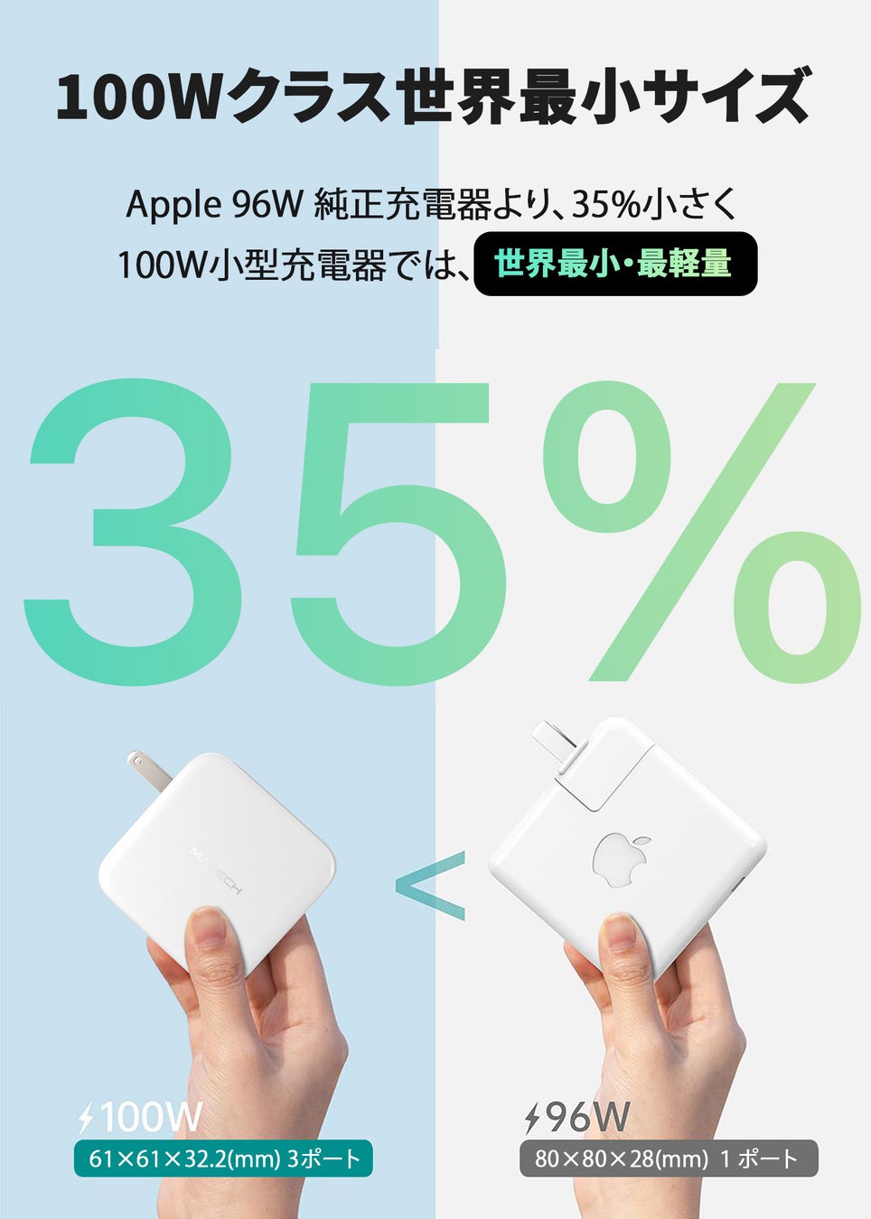 100Wのパワフルな出力なのに、手に収まるサイズまで小さくなりました。96WのApple 純正電源アダプターよりも約35%小さく、また、重量も約35%軽くなりました。(※2022/2/22 時点 自社調べ) 2ポート利用時でもノートPCを含む2台の機器を同時に急速充電が可能です。最大95Wの高出力と高い安全性の両立しつつも、嬉しいコンパクト設計を実現しました。