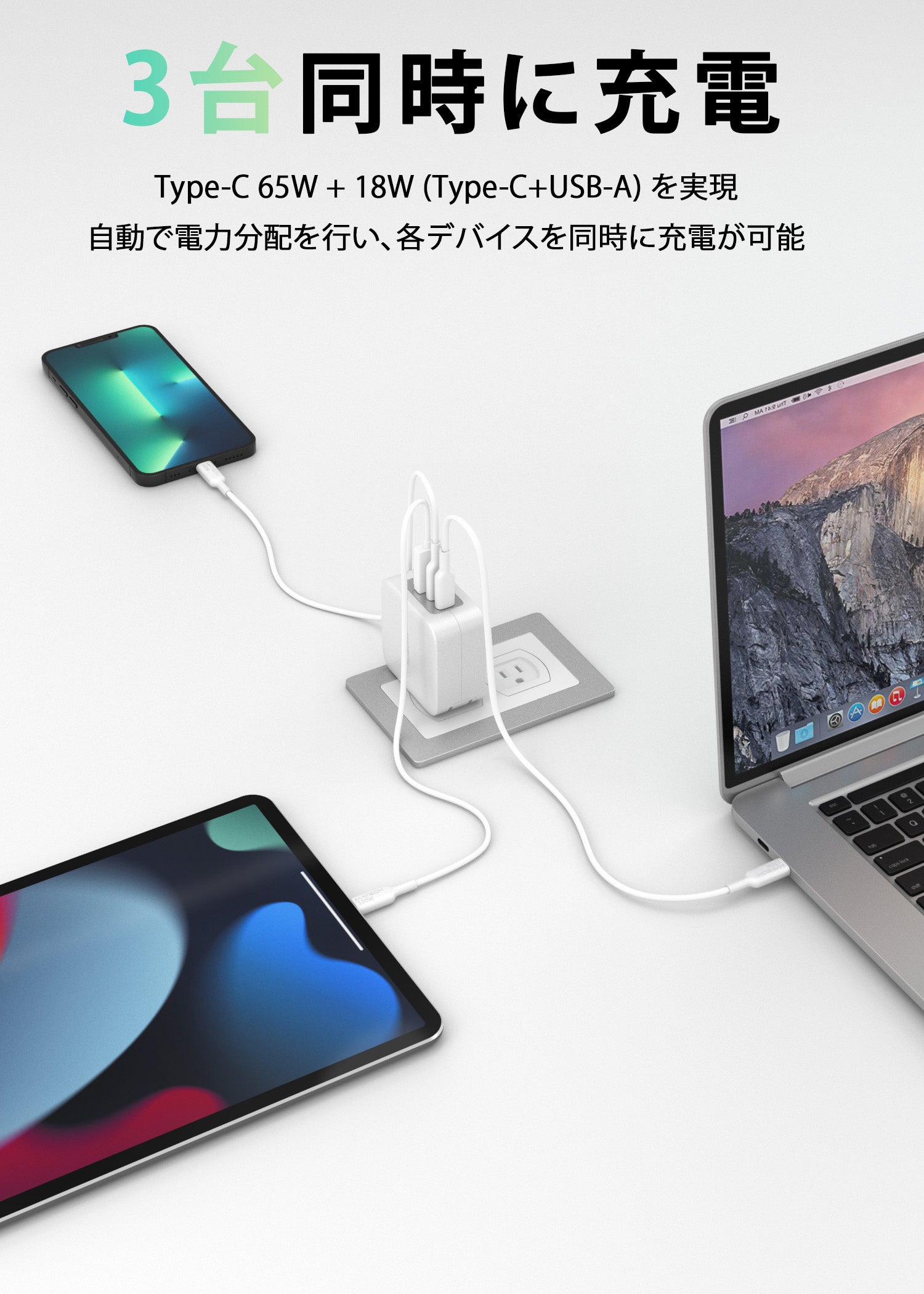 本製品は、窒化ガリウム技術をフルに活用し、Type-C×2個、USB-A×1個の搭載し、スマートフォンからパソコンまで幅広く対応しました。手に収まるサイズ感なのに、3ポートを備えているため、あるゆる場面で活躍します。