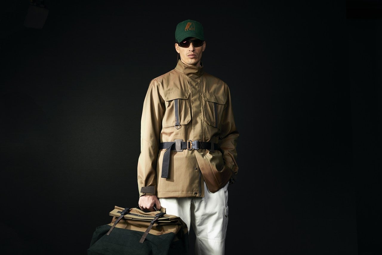 コレクションの中核を担う「Endurance Field Jacket」は、ソラーロ調ウールにラミネート加工を施した高機能アウター。ウエストベルトには、レーシングシートの安全機構から着想を得たディテールを採用し、デザイン性と機能性を両立しています。