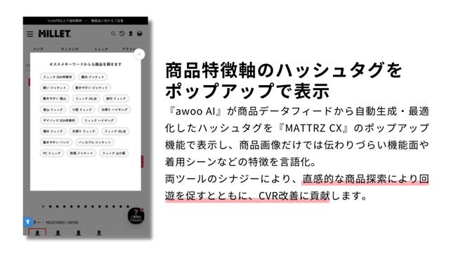 同社はECプラットフォーム「futureshop(フューチャーショップ)」を使用した公式オンラインストアにて、すべてのお客様が感覚的に求める商品に辿り着くことができる商品検索体験を目指し、商品情報からAIが自動でハッシュタグを自動生成・最適化を行う「awoo AI(アウーエーアイ)」と、Web接客・コンテンツ差し込みなど、多様な機能でコミュニケーション最適化・離脱防止を行う「MATTRZ CX(マターズ シーエックス)」を連携した新たな施策を実施しました。