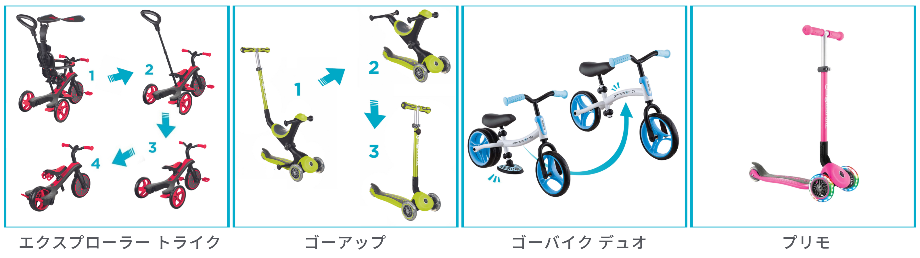 ペダル付き三輪車から二輪のキックバイクに、工具不要でモードチェンジが可能!