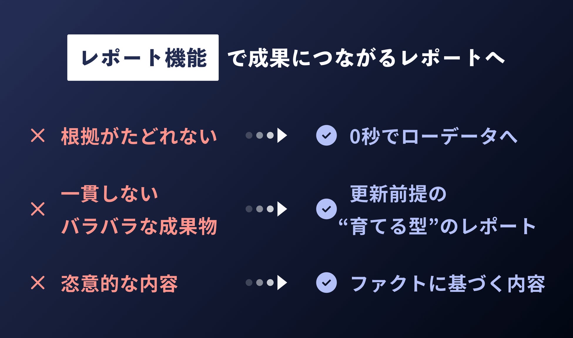 Centouが提供する「レポート機能」ではこれらの問題点を解決し、より事業成果につながるアウトプットづくりを実現することができます。