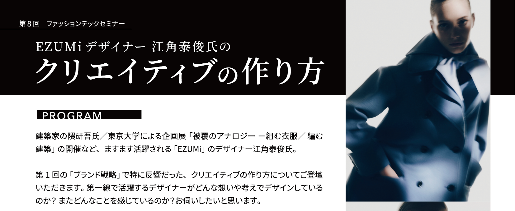 第8回は建築家の隈研吾氏/東京大学による企画展「被覆のアナロジー -組む衣服/ 編む建築」の開催など、ますます活躍される「EZUMi」のデザイナー江角泰俊氏。