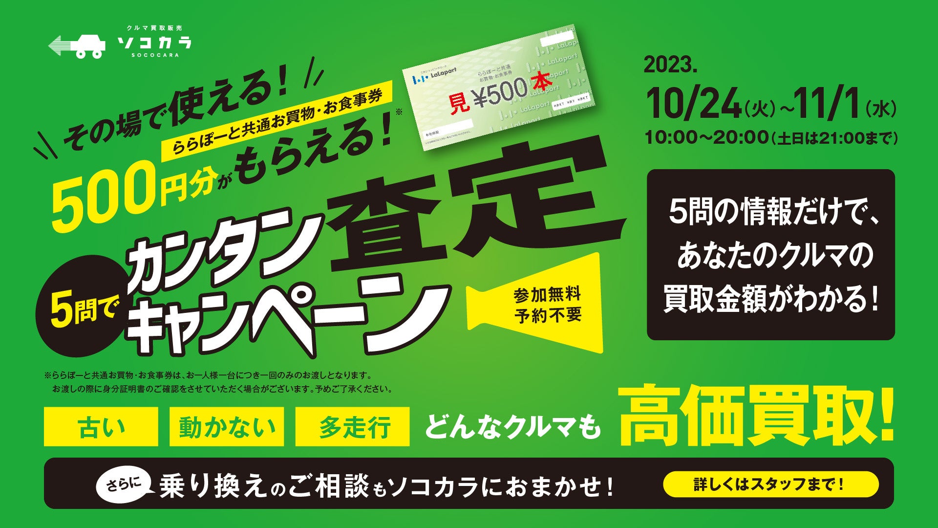 【クルマ買取販売ソコカラ】ららぽーと和泉で愛車の無料査定キャンペーンを実施
