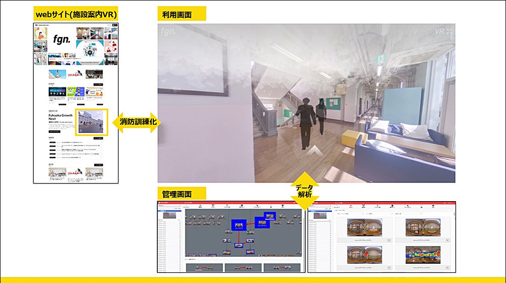バーチャル消防訓練概要:既存の施設案内用のwebVRに後付けでき、人流や視線等のデータ分析が可能