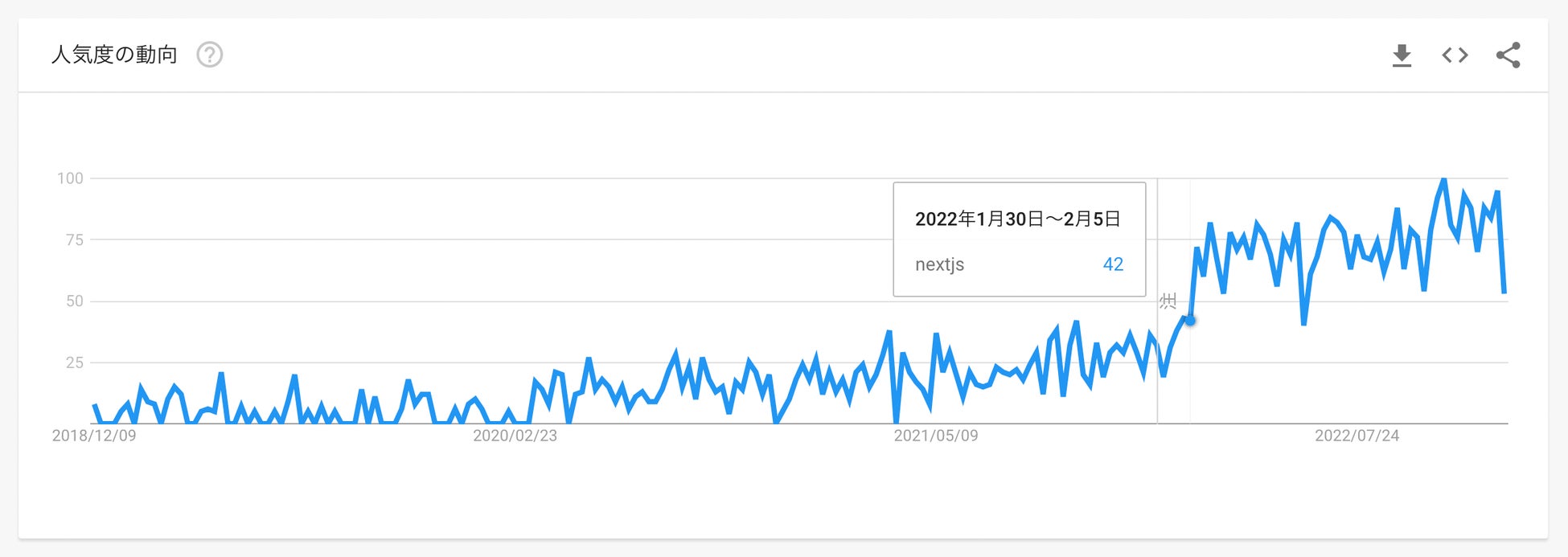 近年、Next.jsはコマンドを使って簡単にアプリケーションを作成できるということで、Next.jsとVercelを使った高速アプリケーション開発など、注目を集めている技術です。Google Trendでの検索数も近年右肩上がりに上昇しています。