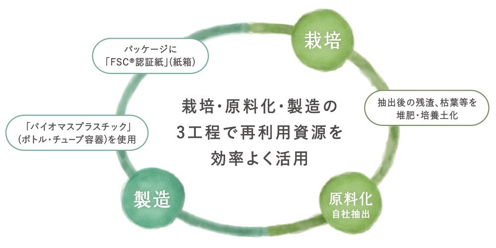 「ラフレンディー ボタニカル」シリーズは、静岡プロダクツセンター内のCPガーデンで大切に育まれた3種の植物エキス(レンゲソウエキス、ウイキョウ葉エキス、ソメイヨシノコンプレックス)を共通成分として配合したほか、環境負荷の軽減を目指し、外箱に「FSC®認証紙」、ボトル・チューブ容器には「バイオマスプラスチック」を採用し、肌と環境への優しさを形にいたしました。