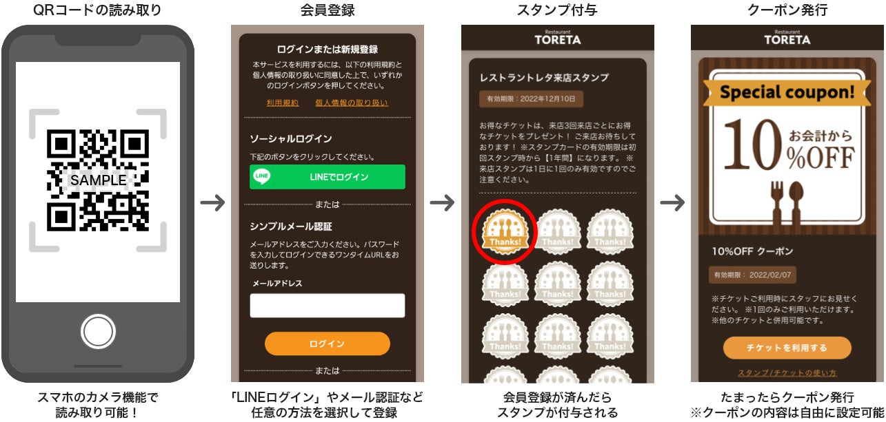 トレタスタンプは、飲食店における顧客の来店履歴を蓄積し、CRMに活用することができる飲食店向けDXツールです。お客様は来店時に自身のスマホでQRコードを読み込むことで、最短2タップで会員登録ができ、来店回数や飲食代などに応じて割引や特典を受けることができます。一方、飲食店は蓄積した会員情報や来店履歴のデータを活用することで、お客様の来店頻度やご利用状況に合わせて、きめ細かい来店促進施策や販促活動を実施できるようになり、LINEやメールを通じた顧客とのコミュニケーション施策の幅を広げることができます。これにより、自店のファン作りや顧客との関係性の把握、再来店促進などのCRM活動を支援します。