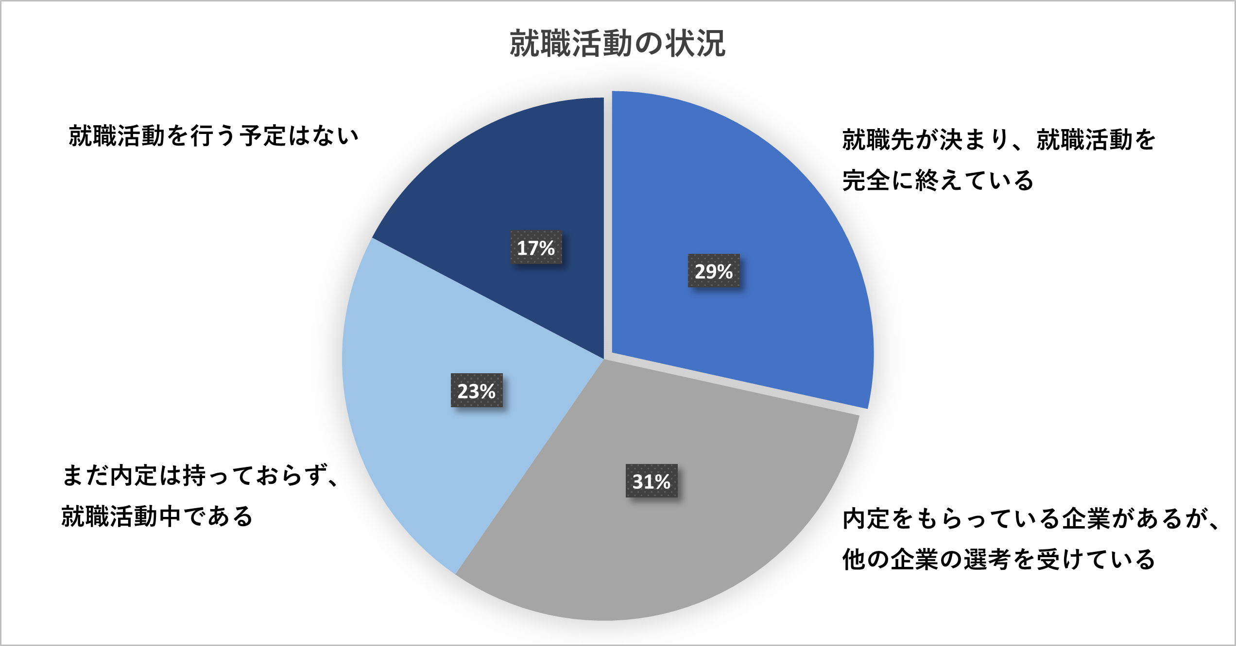 ・現時点での就職活動状況について、4人に1人以上が「就職先が決まり就職活動を完全に終えている」と回答。