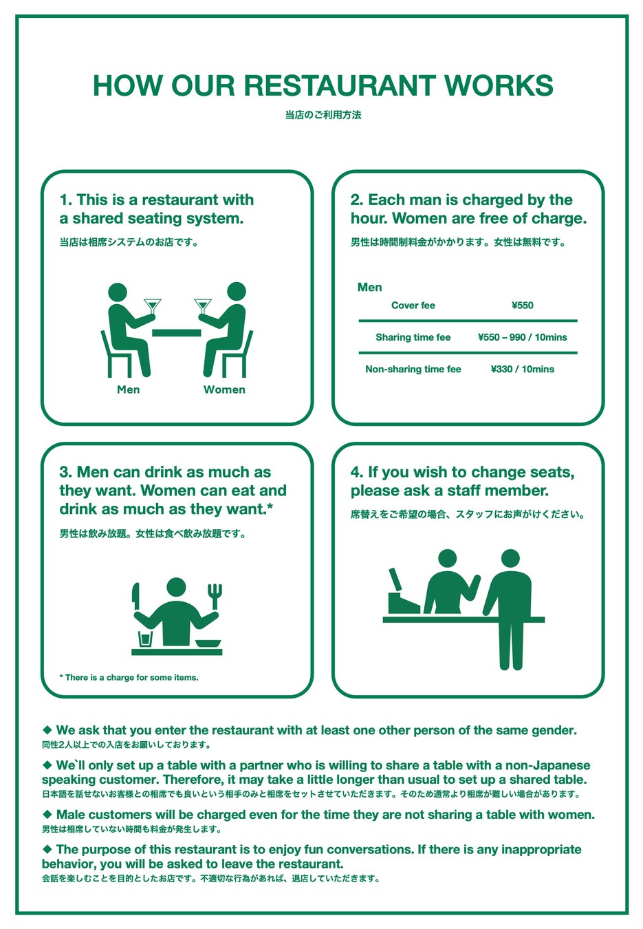 せっかく日本へ旅行に来たので現地の異性と話してみたい。自国にはない相席文化を体験してみたい。日本に住み始めたので日本人の友人が欲しい。そのようなニーズを持つ訪日観光客の方・在日外国人の方こそ是非、ご来店をお待ちしております。