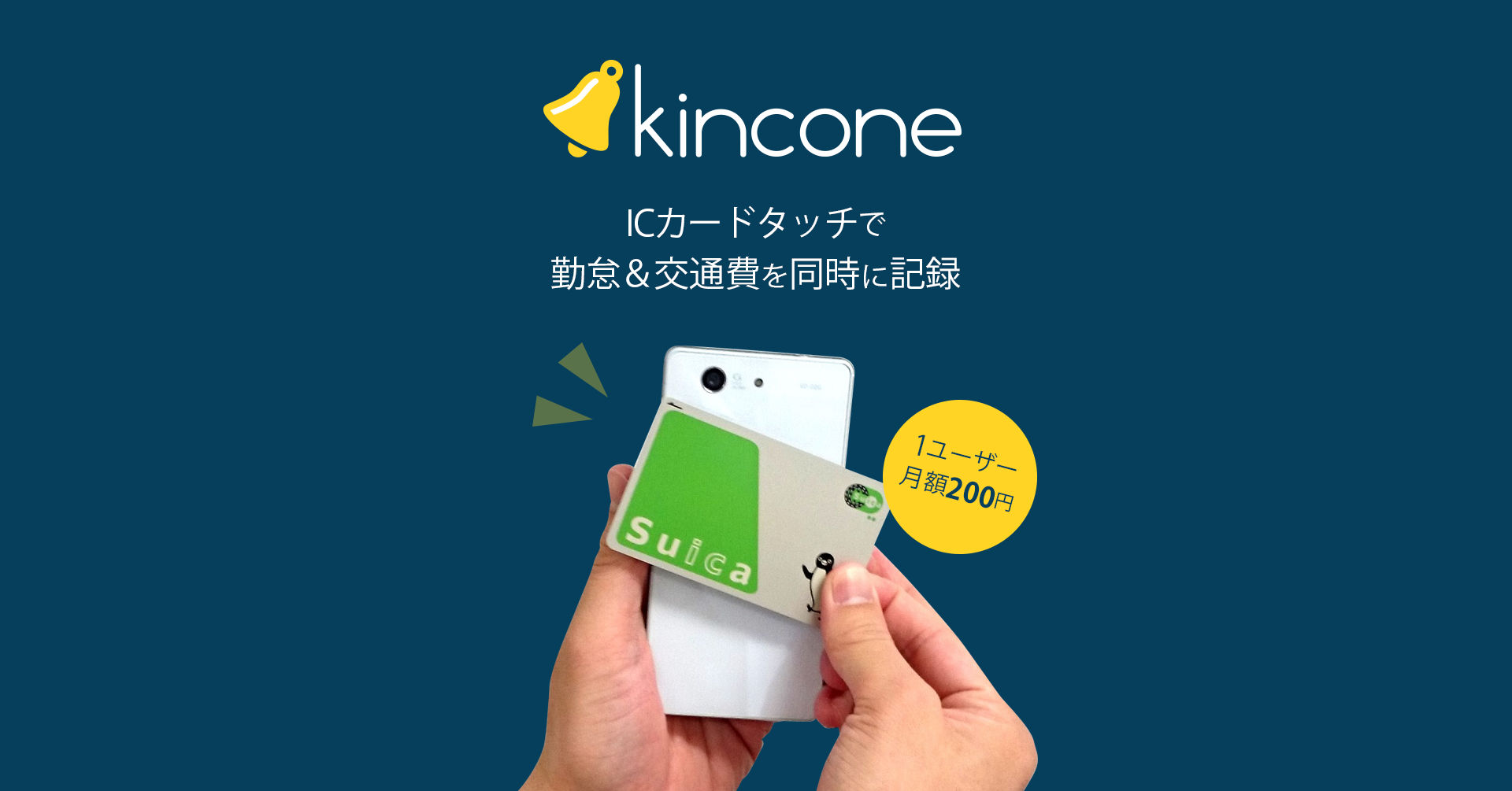 スマホ1台ですぐに始められるシンプルな勤怠管理・交通費精算クラウドです。交通系ICカードを、kinconeアプリをインストールしたスマホにタッチするだけで勤怠と同時に交通費の登録が可能です。