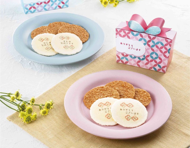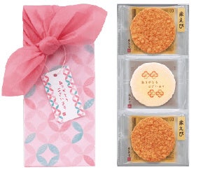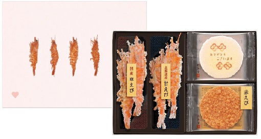 リボン型のかわいらしいパッケージや吉祥柄の箱を風呂敷で包んだ縁起のいいパッケージに、「ありがとうございます」のメッセージが入ったえびせんべいやえびの濃厚な旨みをぎゅっと凝縮した赤えび炙り焼きを詰め合わせました。