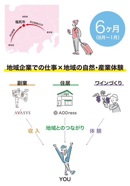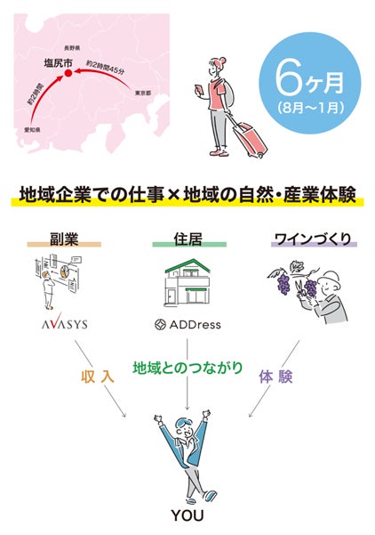 月額9,800円から始められる定額制多拠点居住プラットフォーム「ADDress」を運営する株式会社アドレス(本社:東京都千代田区、代表取締役社長:佐別当隆志、以下「ADDress」)は、長野県に本社を置くソフトウェア開発企業のエプソンアヴァシス株式会社(代表取締役:武井喬、以下「エプソンアヴァシス」)が主催する長野県塩尻市を主な実施地とする社会実験プログラム「『副業 × ワインづくり』で地方暮らしの未来を拓く」に、住まいと暮らしの提供サービスとして参画します。地域企業が抱える課題をITで解決する人材および、長野の地域産業である「ワインづくり」に取り組む副業人材を6月1日より募集します。エントリーの際はADDress会員登録が必要です。
