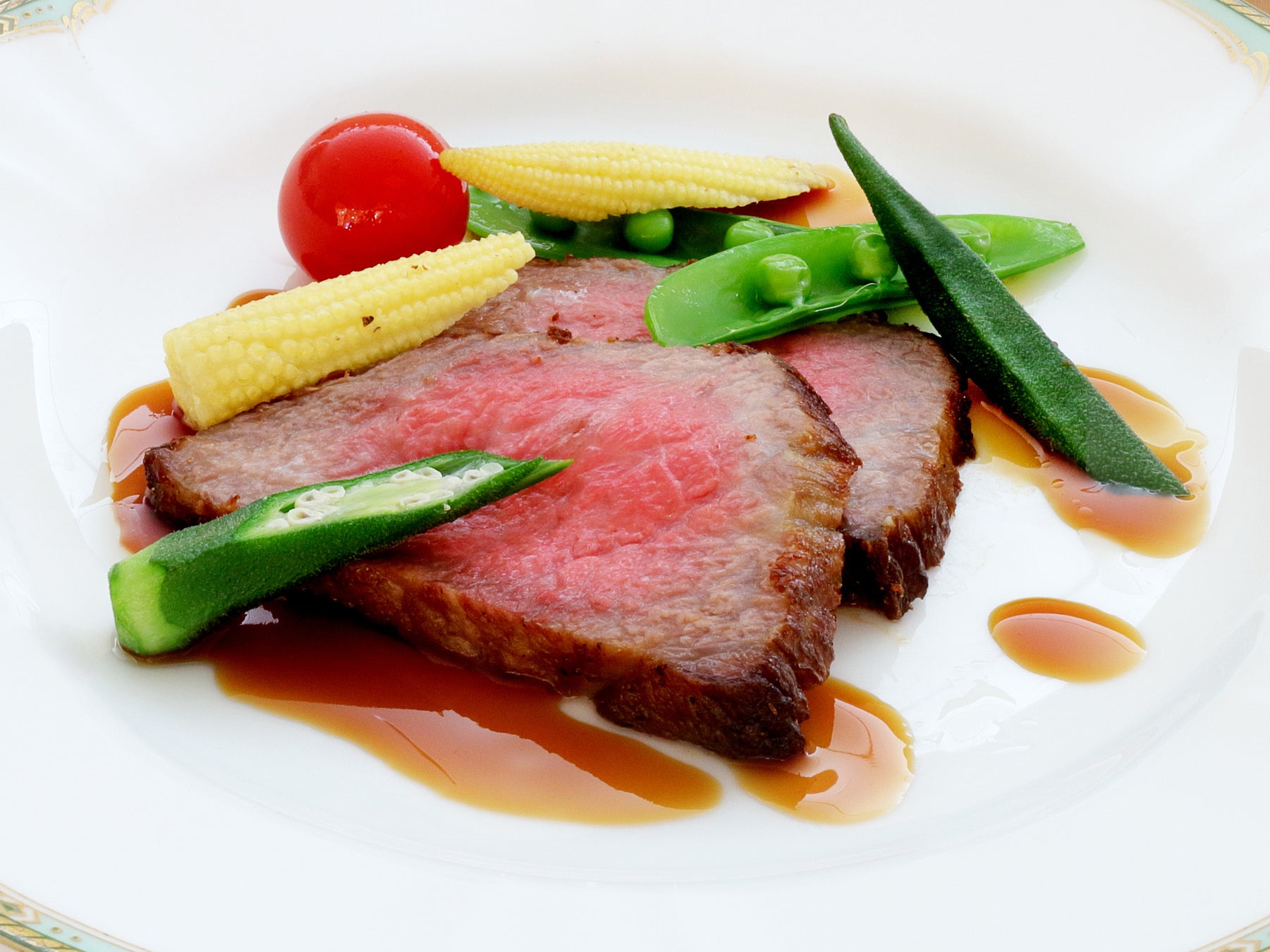 松阪牛モモ肉のステーキ ディジョン産マスタードソース 夏野菜添え