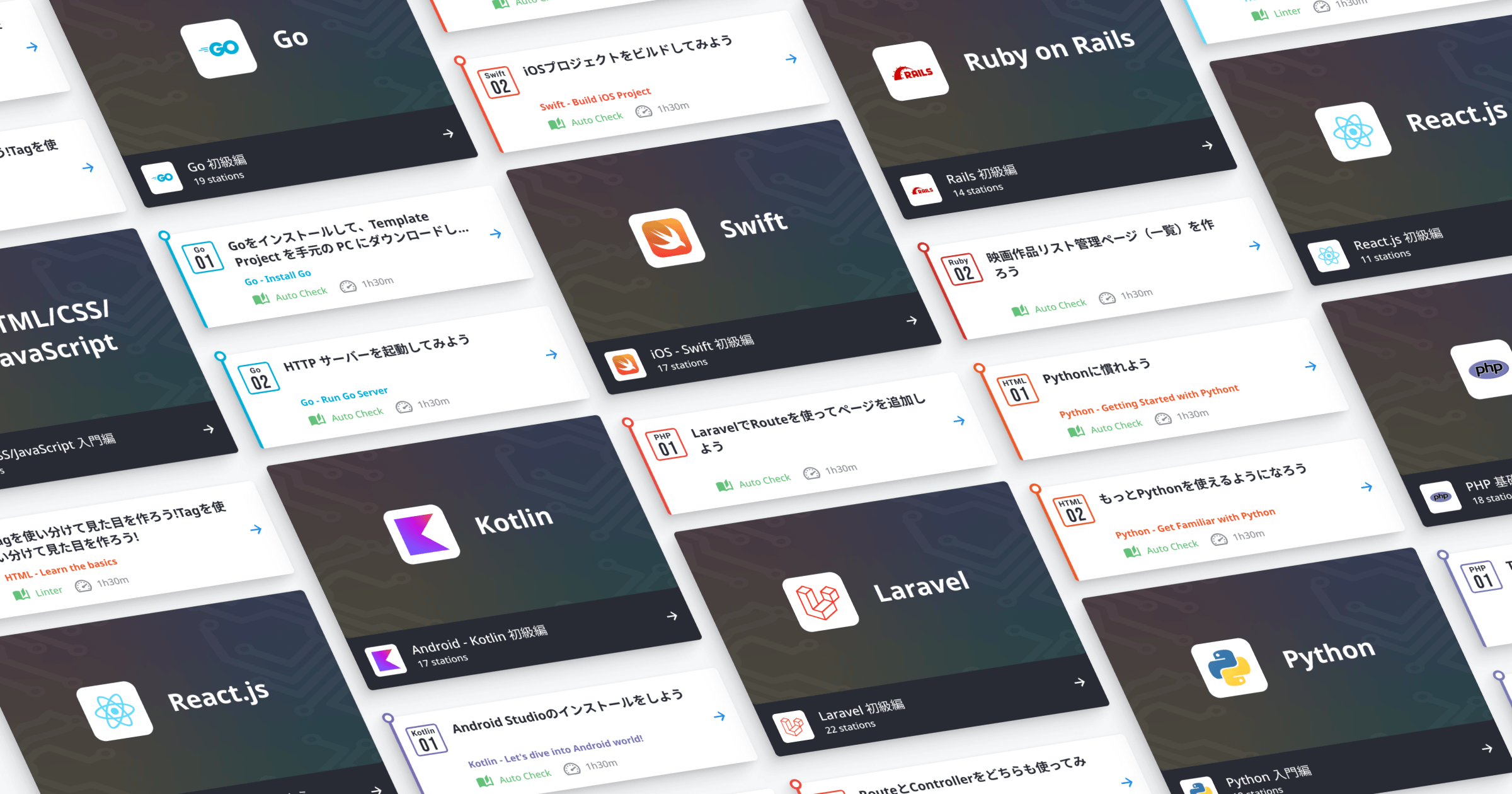 RailwayはTechTrain内で提供している実務に必要な知見を凝縮した「実践型開発ドリル」です。TechTrainにはサイバーエージェント社、LINE社、Adobe社等有名企業で働く60社120名を超える現役ITエンジニアが、「TechTrainメンター」として在籍しています。RailwayはTechTrainメンターの強み・経験・しくじり経験を盛り込んだ教材になっているため、従来のプログラミングスクールのレベルより高い水準で、実務で必要な知見を習得することができるドリル形式の教材です。2021年に第1弾を公開し、現在17チャプター・212問のドリルを公開しています。