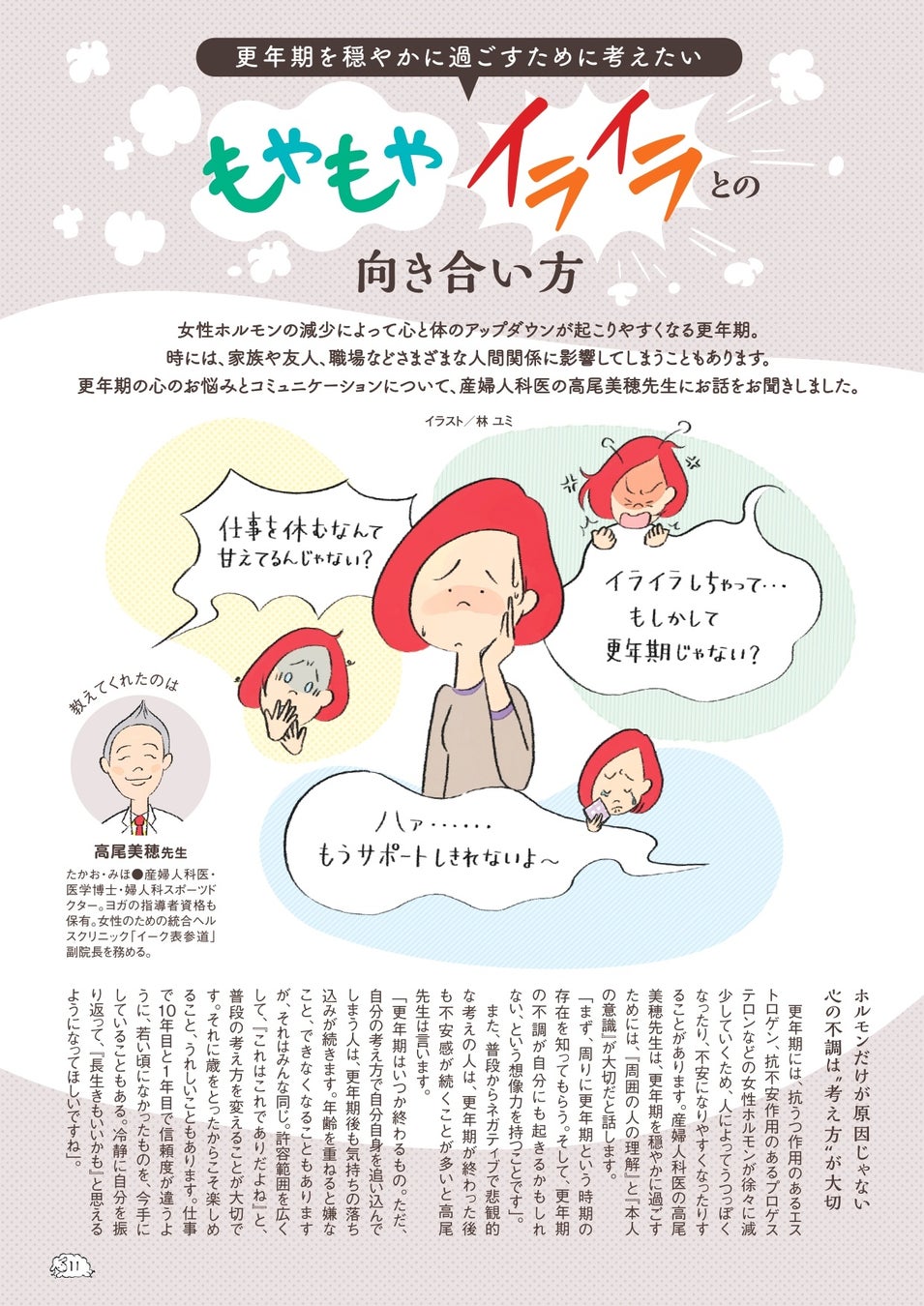 「人生を陽気に楽しみ、心身ともに健やかに生きる」をテーマに、女性が抱えるお悩みや課題に対して、参考になる情報を隔月でお届け。記事は医師、看護師、栄養士、ケアマネジャーなどの専門家監修によるヘルスケアの記事を中心に、健康、美容、食、旅、生き方などのライフスタイルに関する企画も掲載しています。