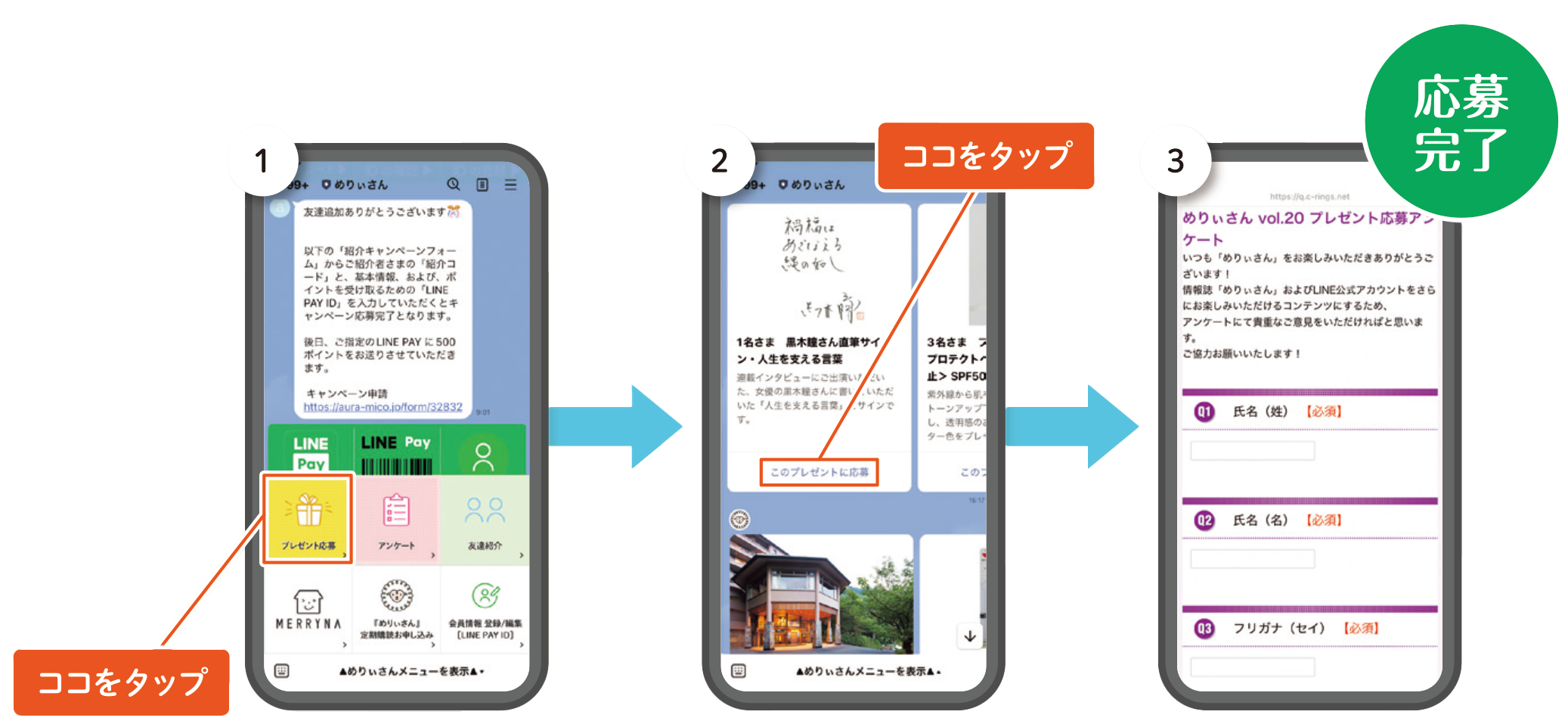 (1)『めりぃさん』公式LINEアカウントのメニューを開いて「プレゼント応募」をタップ。