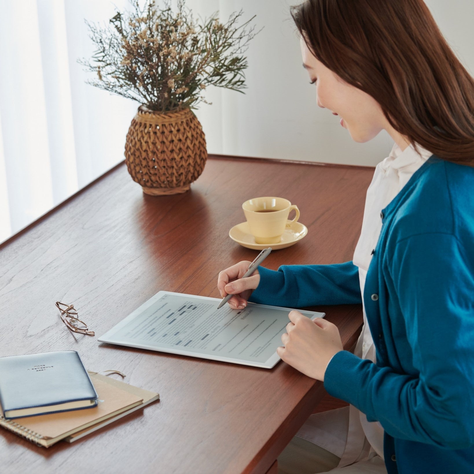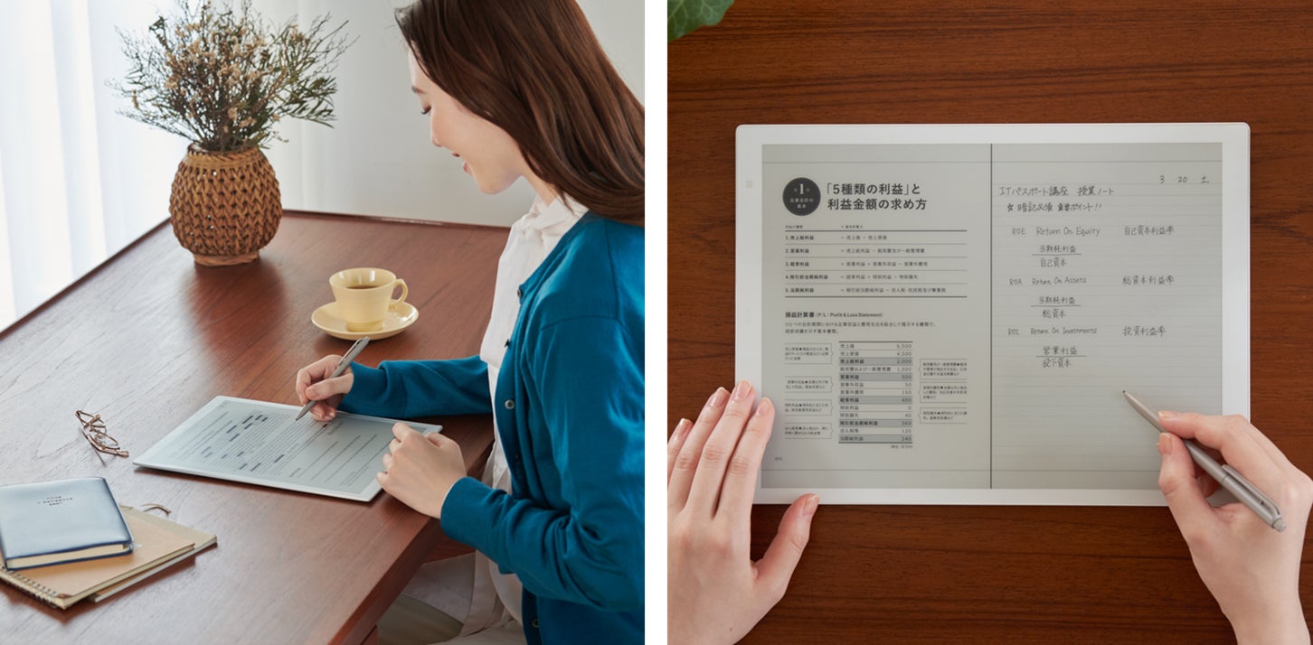 「本物の紙とペンのようなスムーズな書き心地」「くっきり見やすく目に優しいディスプレイ」「持ち歩きがストレスにならない驚きの薄さと軽さ」を実現した電子ペーパー。手書きでメモをとるのはもちろんのこと、パソコンやスマートフォンからPDFデータを取り込み、直接書き込むことも可能。一般的な大学ノート約20万冊相当のデータがこれ一台に。会議のメモをとる、手帳のようにスケジュールを管理する、問題集を解く、イラストを描くなど、仕事でもプライベートでも、様々なシーンに寄り添います。