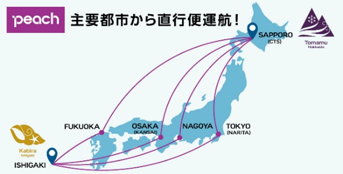 東京(成田)、大阪、名古屋、福岡の主要都市から石垣島、札幌まで直行便がデイリー就航となり、リゾートまでのアクセスが便利です。