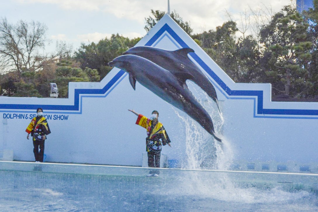 和テイストのBGMに合わせて、イルカたちが元気いっぱいパフォーマンス!