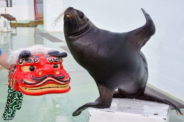 アシカがくるくる廻る独楽ダンスを舞い、2022年の験を担いだおめでたいショーをお届けします。