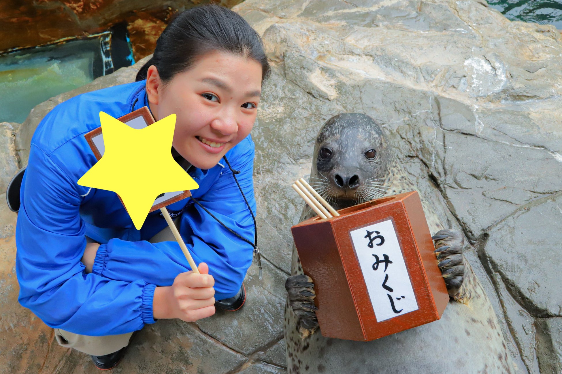 アザラシのコミカルでかわいらしい姿で2022年の初笑い!お客様と一緒に新年の運試しを行う