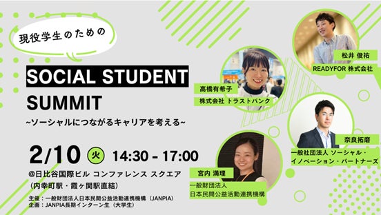 一般財団法人日本民間公益活動連携機構(所在地:東京都千代田区、理事長:二宮 雅也、英文名: Japan Network for Public Interest Activities、略称:JANPIA) は、2026年2月10日(火)に現役学生を対象としたキャリアイベント「SOCIAL STUDENT SUMMIT ~ソーシャルにつながるキャリアを考える~」を東京都千代田区・日比谷国際ビルにて開催します。