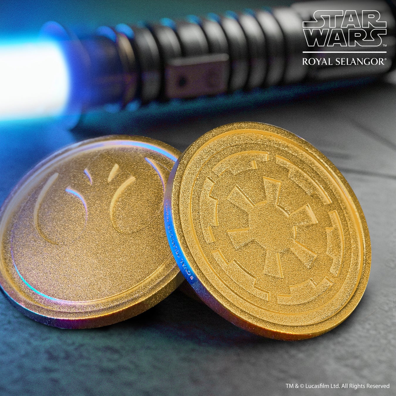 反乱軍バージョンは品格溢れるサテン仕上げ、帝国軍バージョンは重厚感あふれるダークトーンで彩られています。ピューターで精緻に造形されたこのメダリオンは、手に取ればその重みに、スター・ウォーズ サーガの不朽の精神を感じさせます。