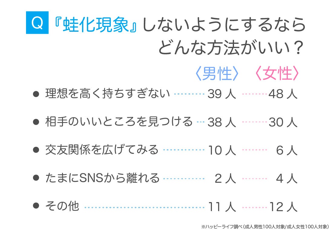 『蛙化現象』しないようにする方法では、男女ともに『理想を高く持ちすぎない』が多いことがわかりました。