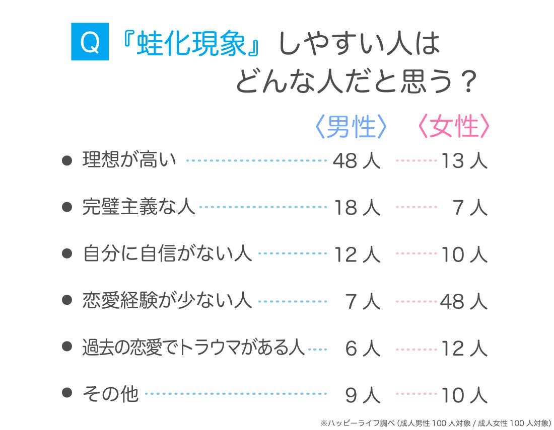 蛙化現象しやすい人の特徴は、男性の場合は『理想が高い』と答えた人が多数を占めていました。