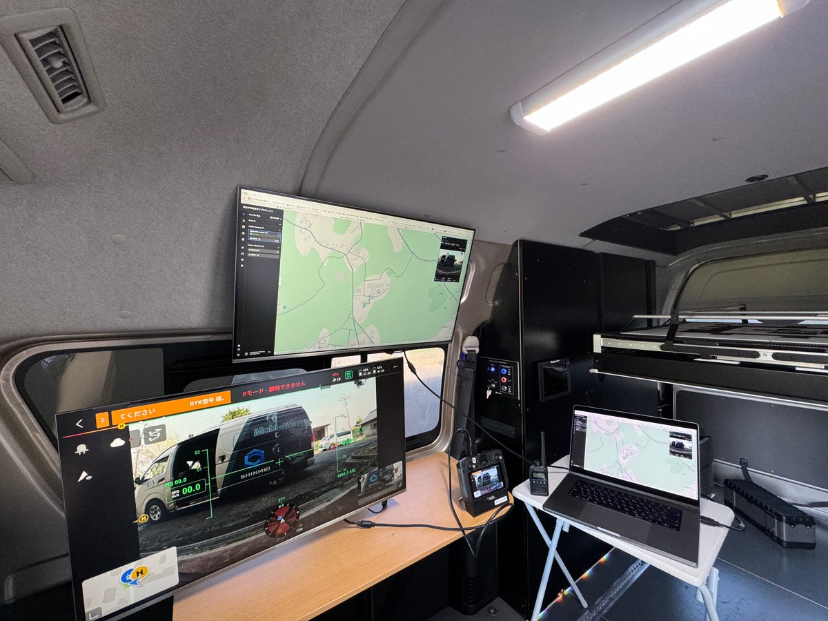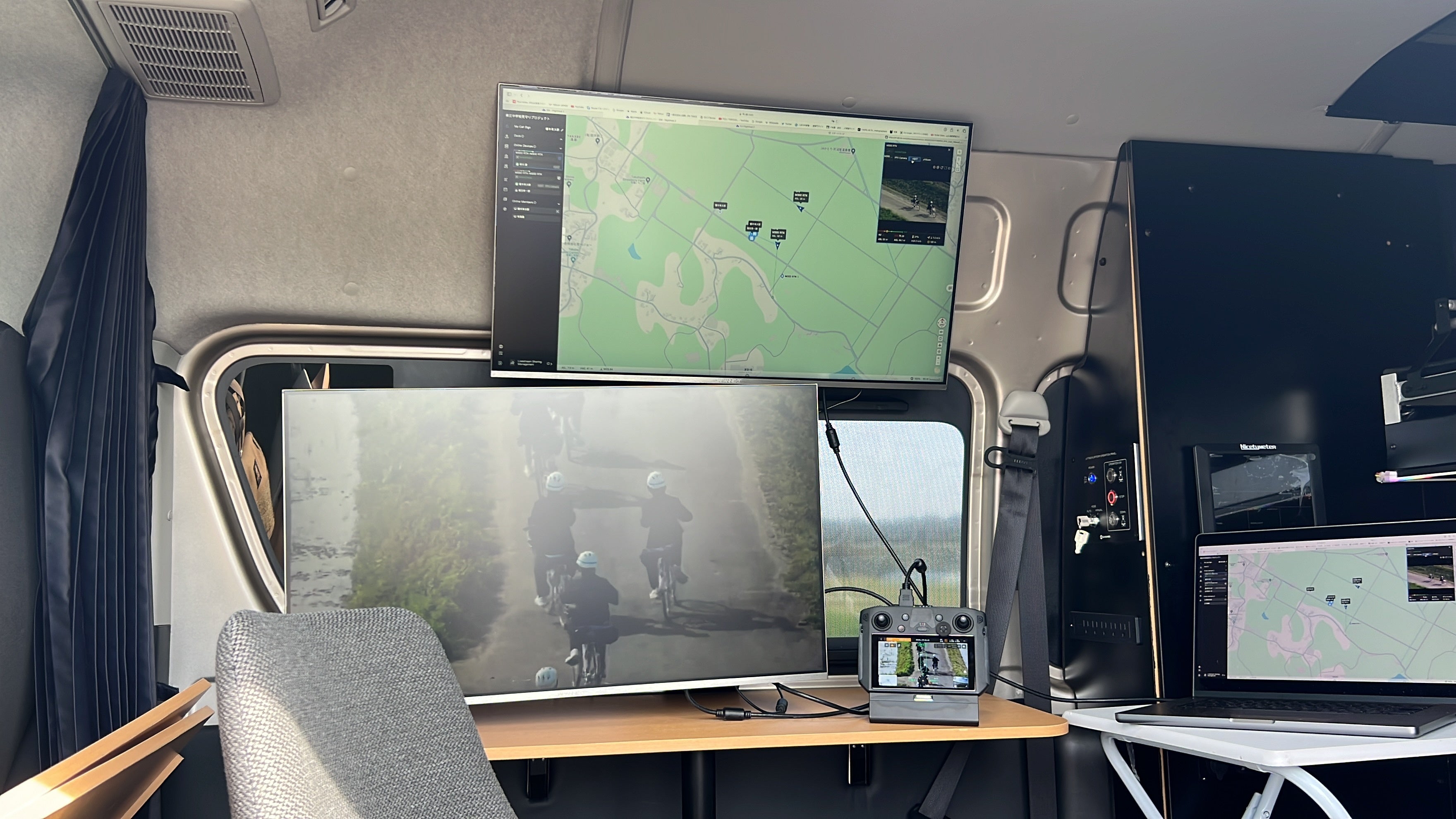 ドローンポーターの車内の様子:モニターで地図とカメラの映像の両方が監視できます