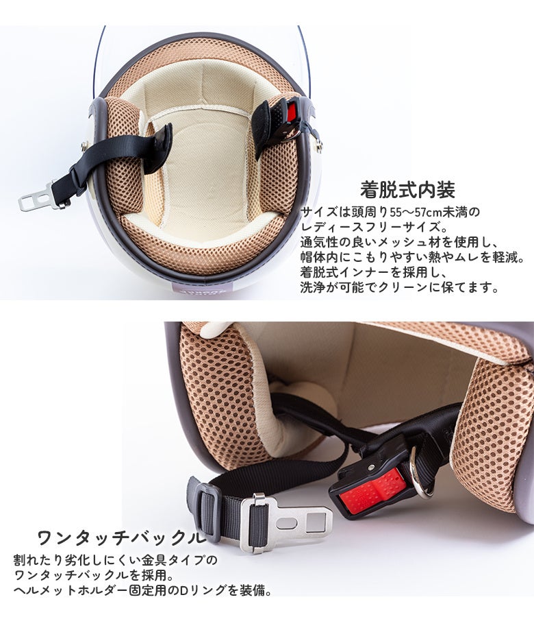 ヘルメットの帽体はリード工業のレディースジェットヘルメット"NOVIA"の帽体を使用。