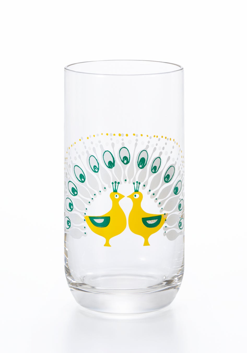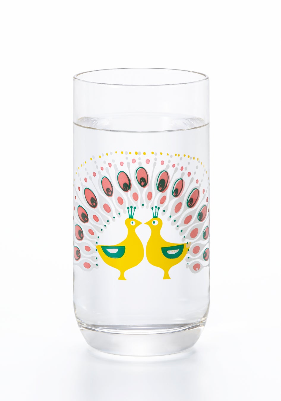 2羽のクジャクが仲良く並んだ「クジャクのおしゃべり」は昭和55(1980)年に発売された柄です。冷たい飲み物を注ぐとグラスの絵の色が変わる「魔法のグラス」という柄の一つとして登場しました。扇子のように美しく広がった羽の模様が、華やかに色付きます。見つめ合うクジャクたちは一体何を話しているのでしょうか?思わず耳を傾けてみたくなります。