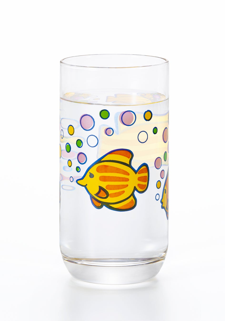 くりっとしたお目々がキュートな「熱帯魚」は昭和54(1979)年に発売された柄です。冷たい飲み物を注ぐとグラスの絵の色が変わる「魔法のグラス」という柄の一つとして登場しました。鮮やかな黄色の熱帯魚に、ピンク色の縞模様が浮かび上がります。プクプクと泡を出しながら、まるでグラスの中を泳いでいるような姿がかわいらしいデザインです。