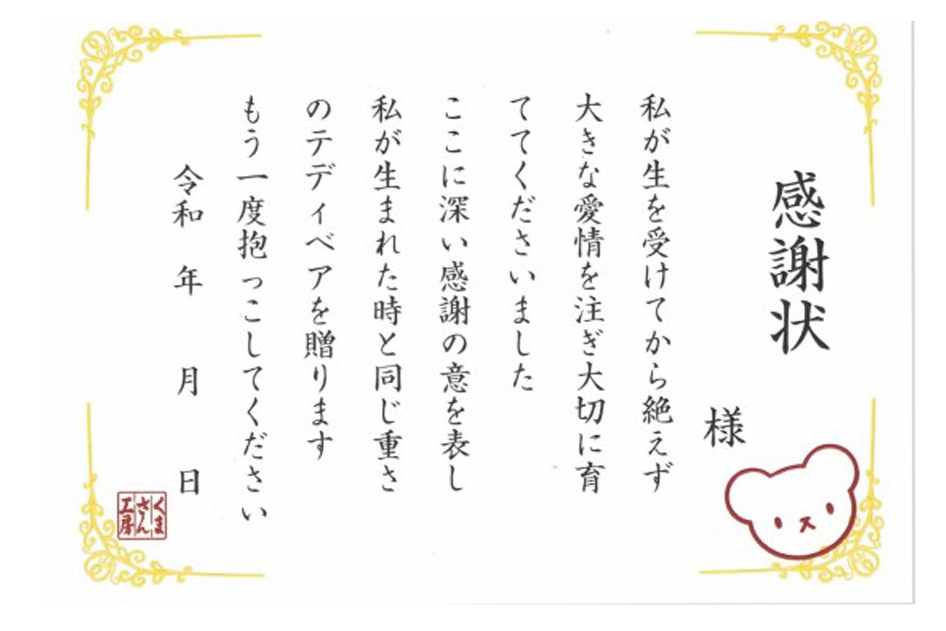 ポストカードサイズのくまさん工房オリジナル感謝状。心温まる1枚は、ウエイトベアと一緒に贈ることで、「感謝」の想いをさらに演出します。